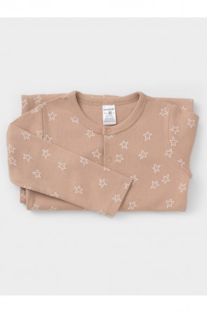 Комбинезон для новорождённого из мягкого эластичного трикотажа, произведённого из натурального хлопка. Застёгивается спереди на кнопки. Оригинальная набивка выполнена из стойких гипоаллергенных текстильных красителей. Все трикотажные полотна производятся в соответствии с нормами швейцарского сертификата ЭкоТекс.