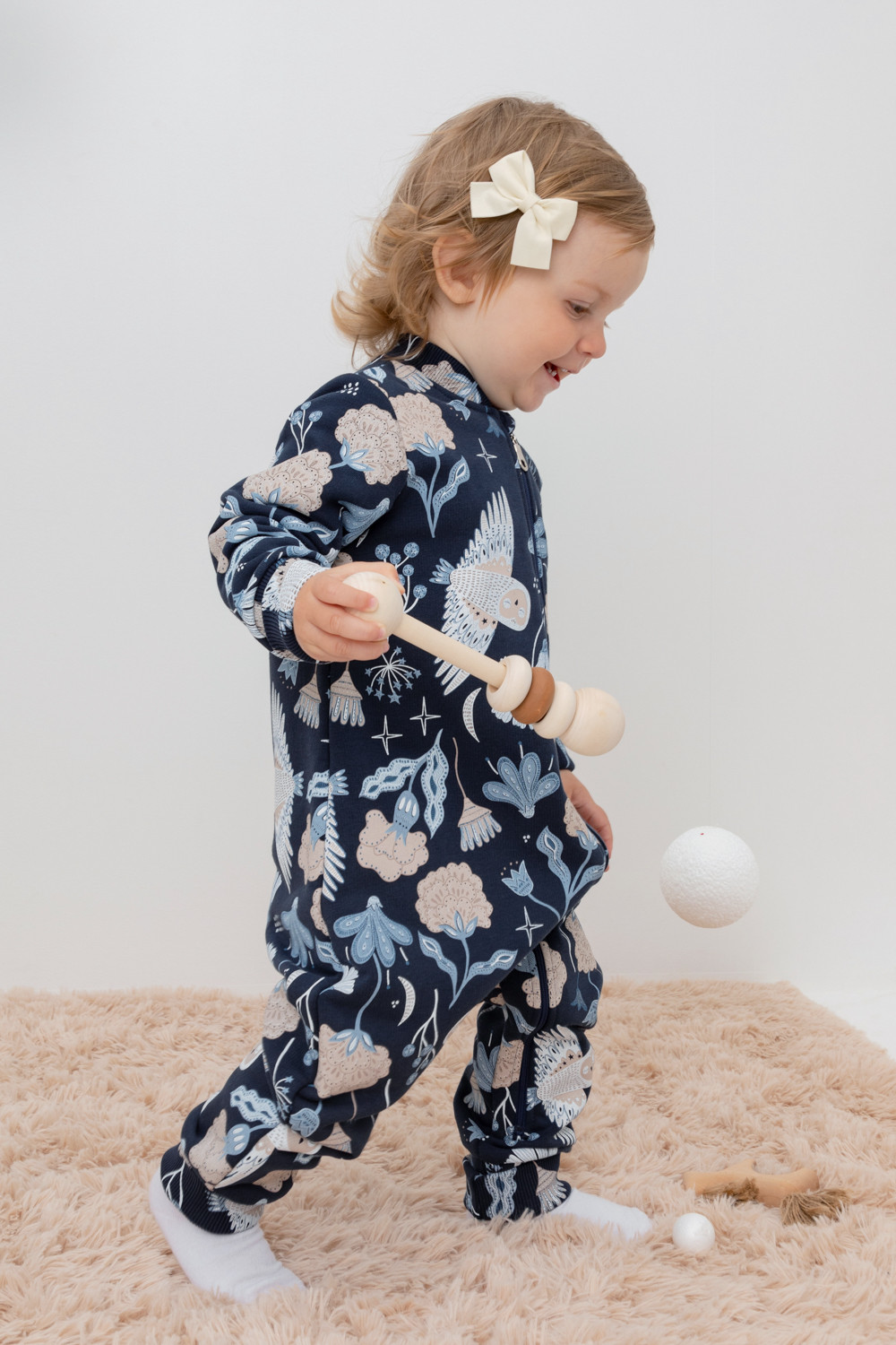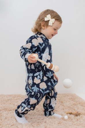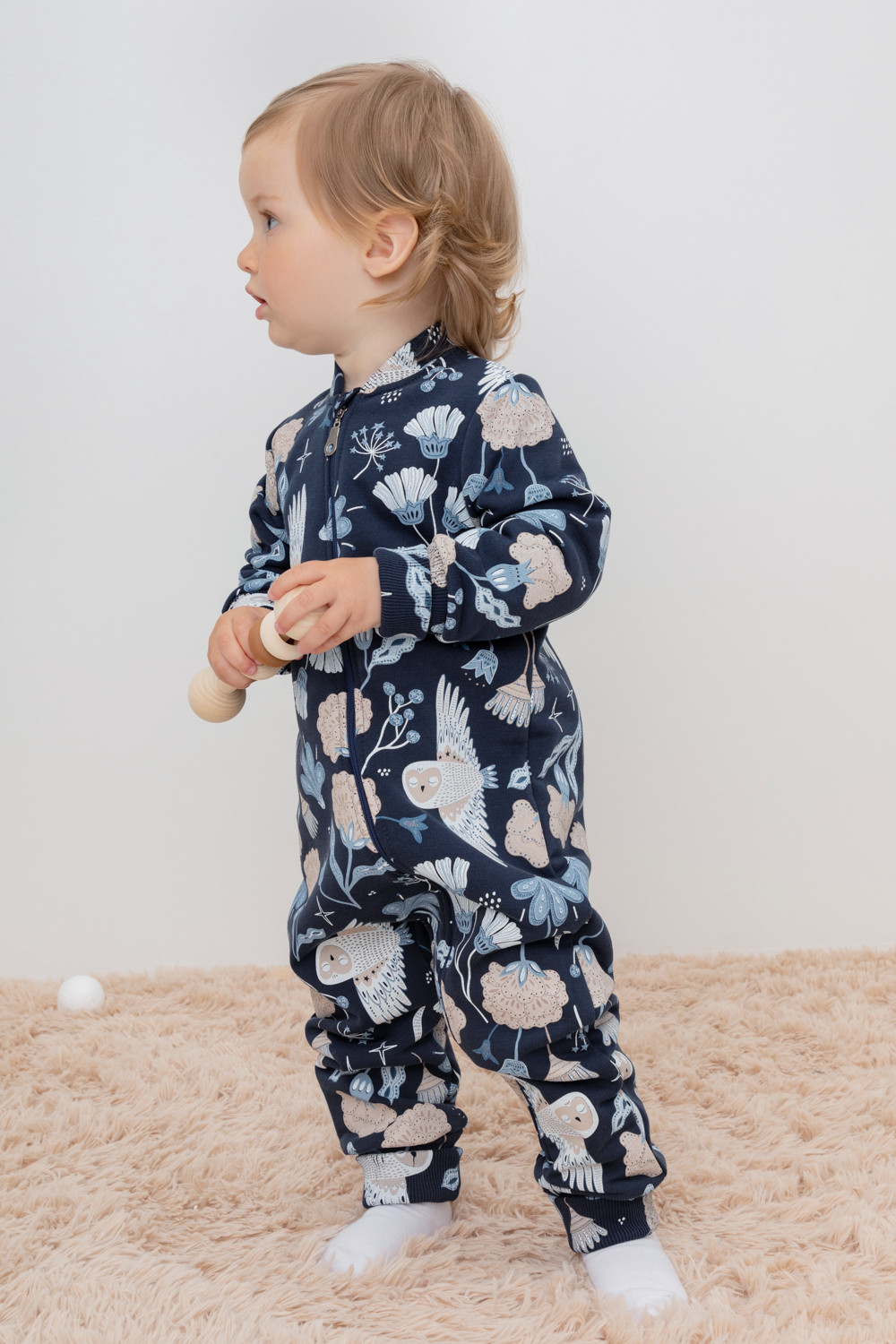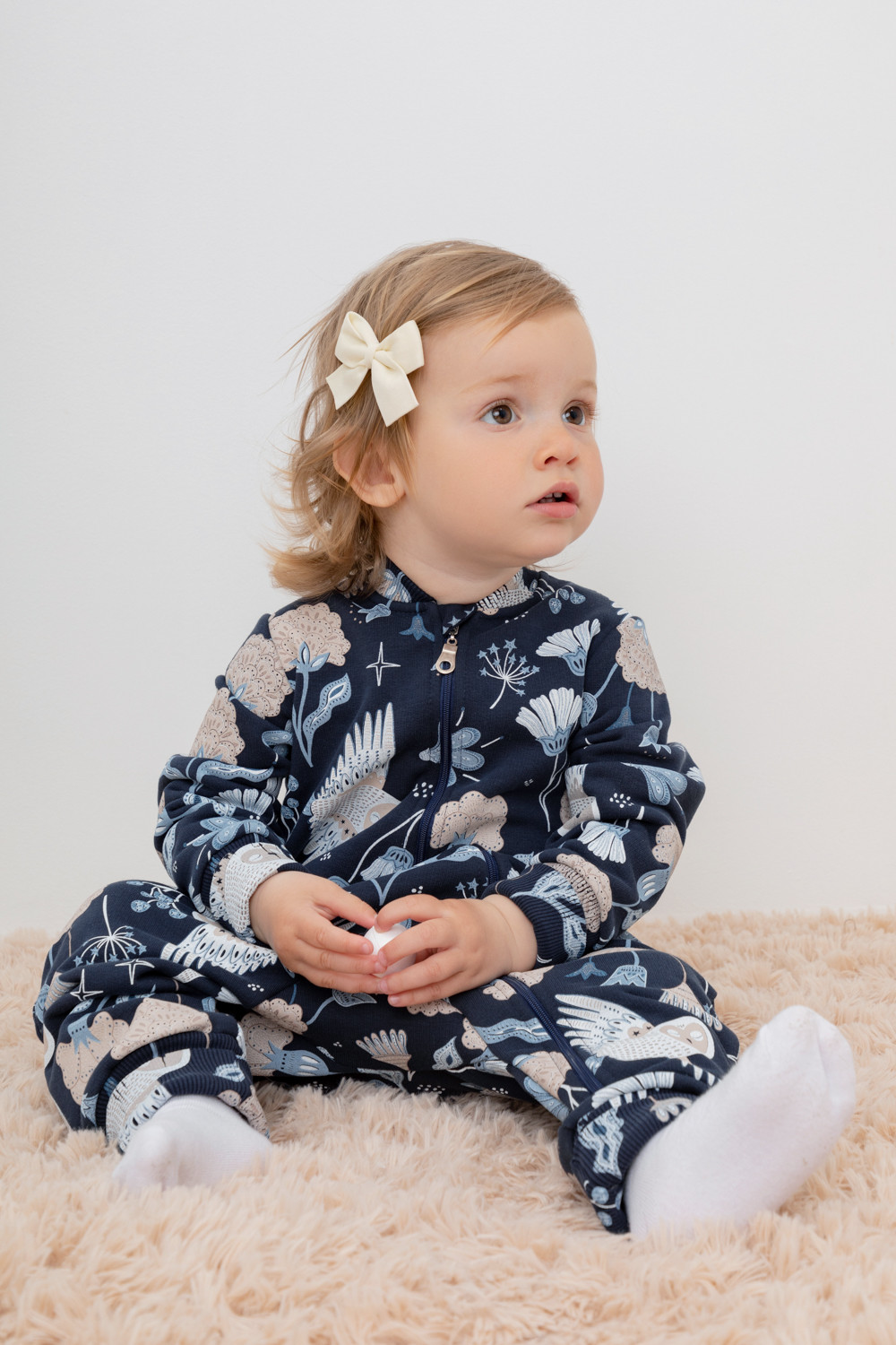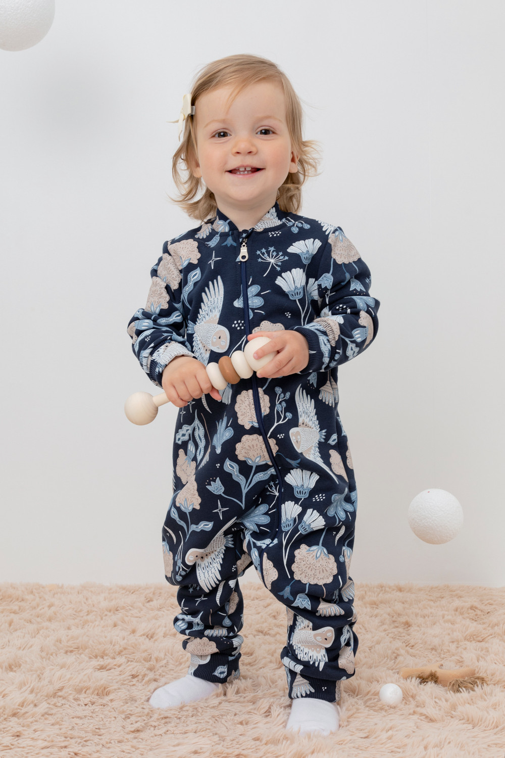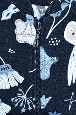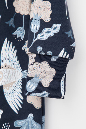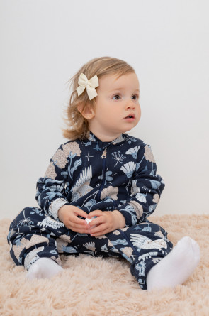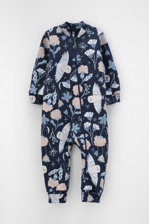 Набивной комбинезон для девочки из петельчатого футера. В составе 80% натурального хлопка и 20% полиэстера, при этом полиэстер ввязан внутрь по особой технологии и не соприкасается с кожей. Изделие застегивается на молнию, имеет защиту для шеи и подбородка. Оригинальная набивка выполнена из стойких текстильных красителей. Комбинезон сохраняет цвет и форму после многократных стирок.