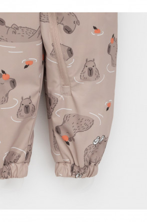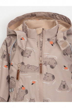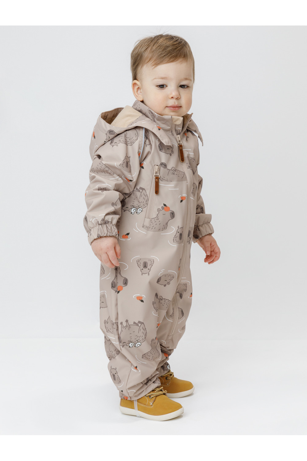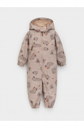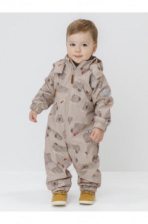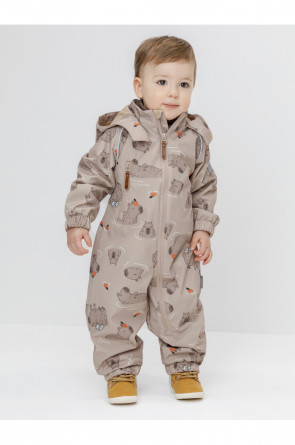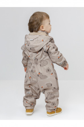 Ветровочный комбинезон ясельный без утеплителя. Выполнен из мембранной ткани с дополнительной тефлоновой обработкой. Данный вид обработки предохраняет изделие от загрязнения и лучше отводит влагу. Подклад из 100% хлопка. Для удобного одевания комбинезон застёгивается на удлинённую молнию с защитой подбородка. Утяжка на капюшоне с потайным стоппером. По низу рукавов и брючин, а также на спинке изделия предусмотрены эластичные резинки для лучшего прилегания. Для фиксации комбинезона используются съёмные силиконовые штрипки. В размерах 68-74 и 74-80 есть функциональные отвороты на рукавах и брючинах. Во всех изделиях верхнего ассортимента для безопасности ребёнка предусмотрены светоотражающие элементы.