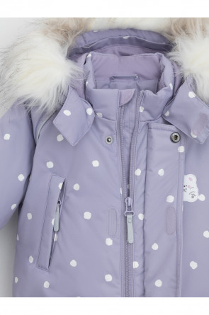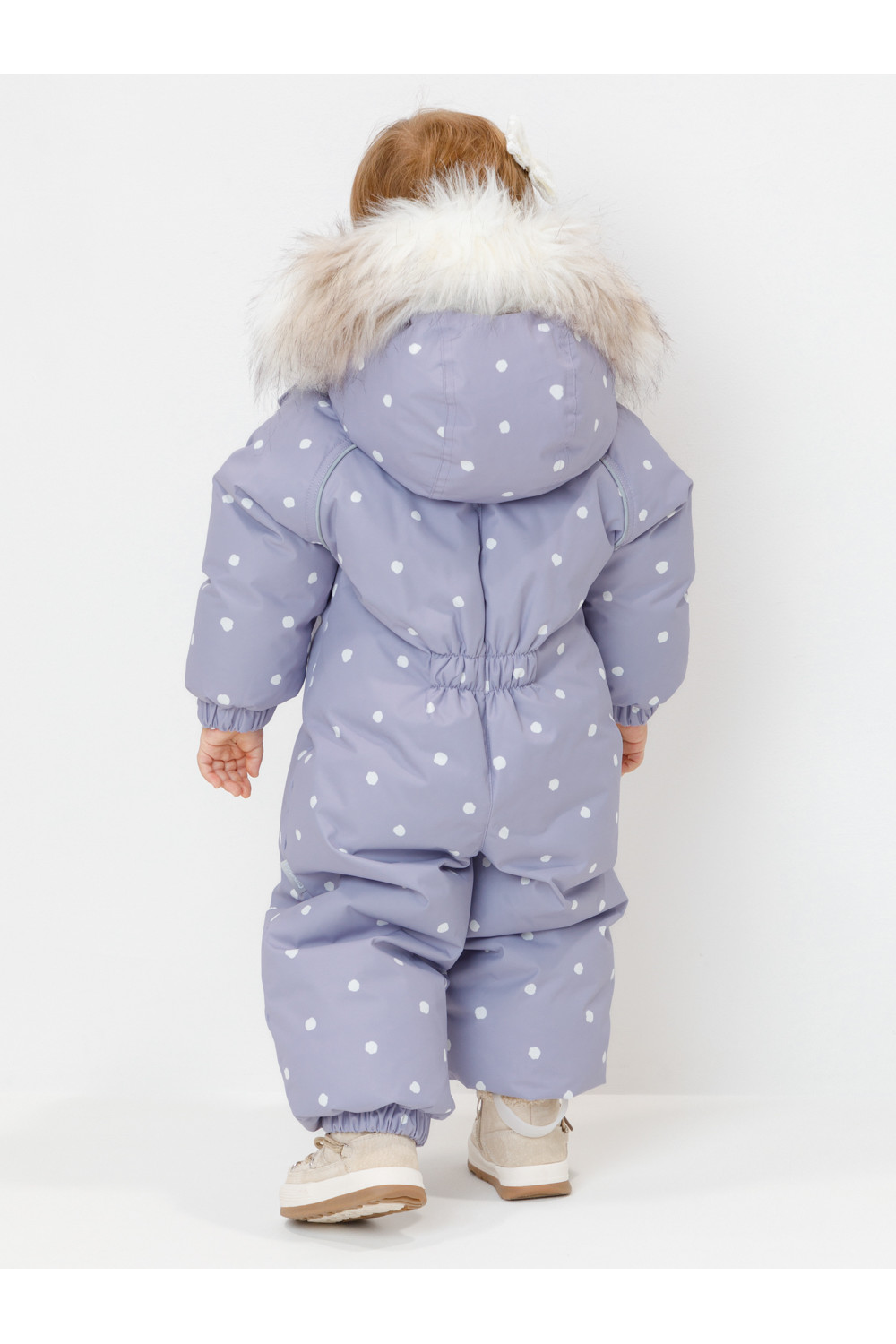 Зимний комбинезон ясельный с натуральным утеплителем из гусиного пуха (70%) и пера (30%). Выполнен из мембранной ткани с дополнительной тефлоновой обработкой, которая предохраняет изделие от загрязнений и отталкивает влагу. Подклад выполнен из 100% хлопка. Комбинезон застёгивается на молнию и внешнюю планку на липучках, предусмотрена защита подбородка. Несъёмный капюшон имеет эластичную утяжку со стопперами и отстёгивающийся мех на молнии. Резинка по спинке для лучшего прилегания. На груди карман на молнии. По рукавам и низу изделия эластичные манжеты, на ножках отстёгивающиеся силиконовые штрипки. В размерах с 68-74 по 80-86 в комплекте идут рукавицы и пинетки. Во всех изделиях верхнего ассортимента для безопасности ребёнка предусмотрены светоотражающие элементы.