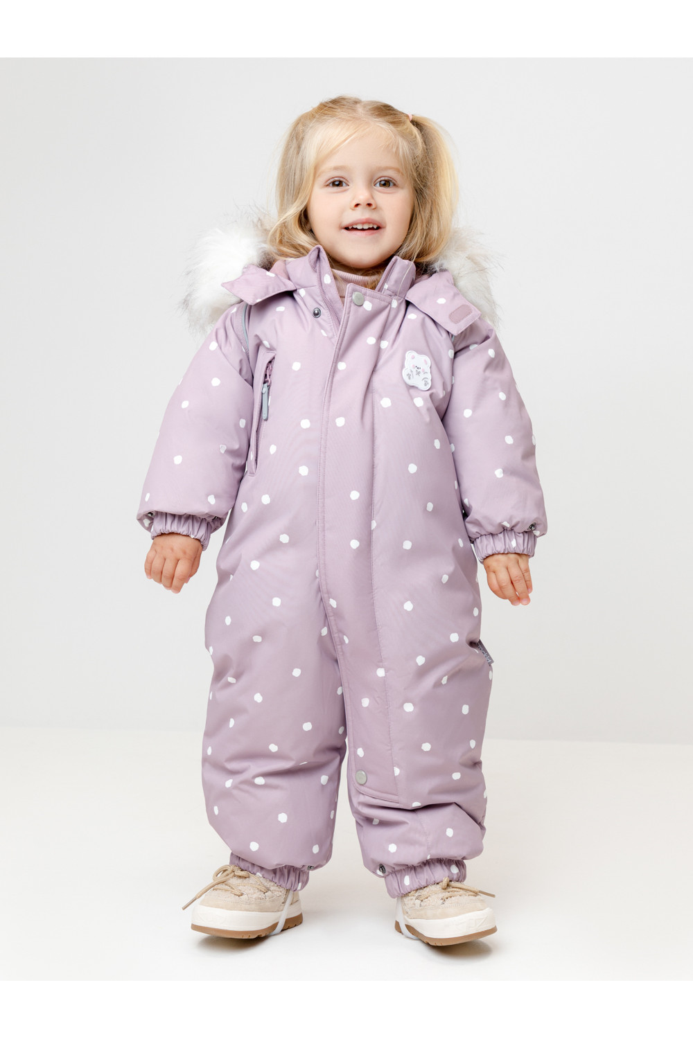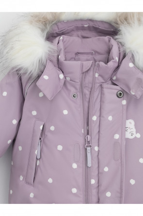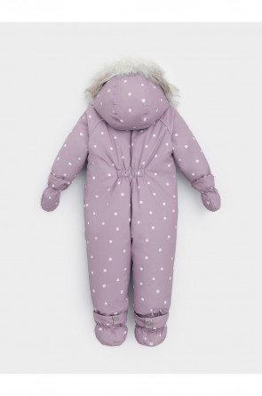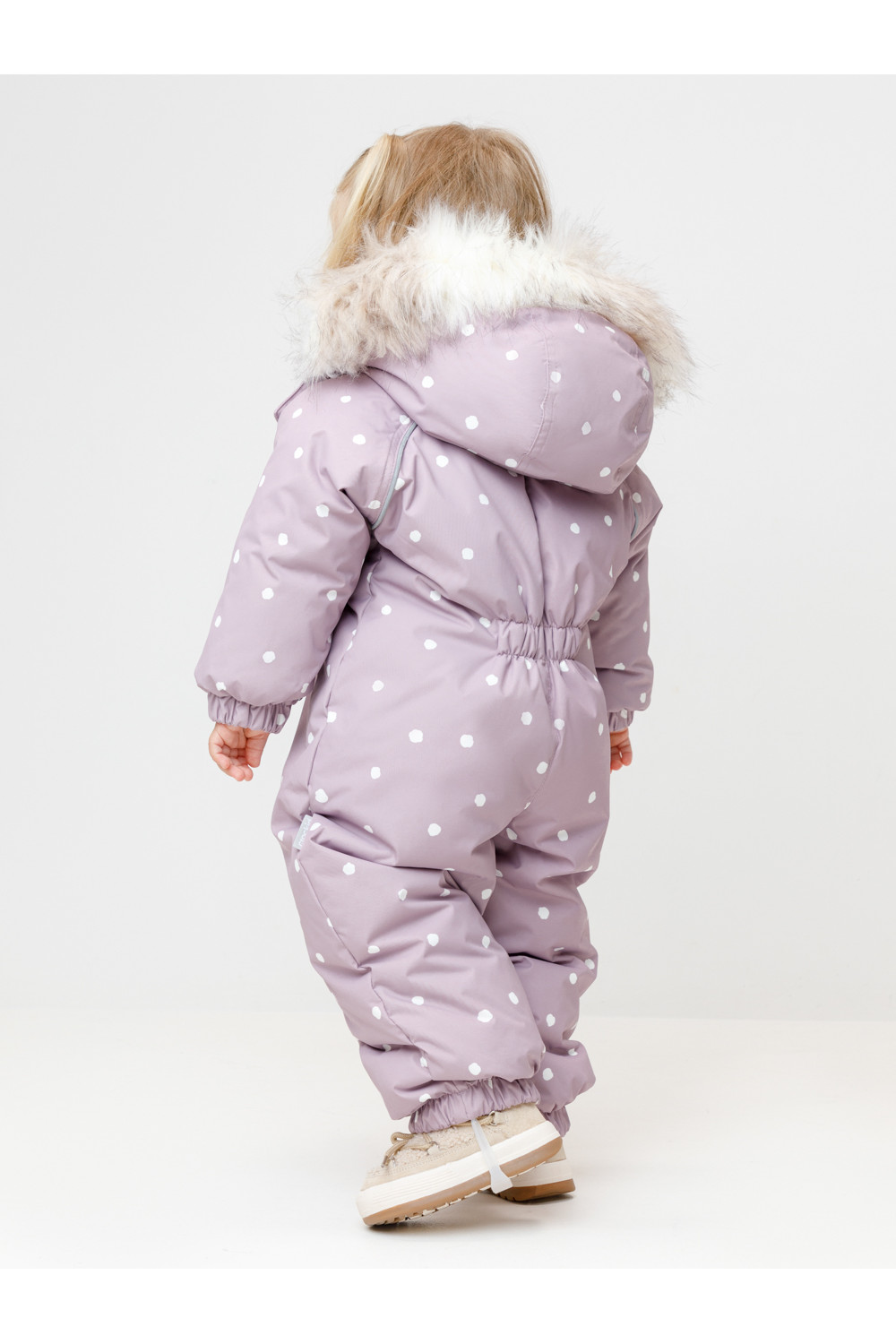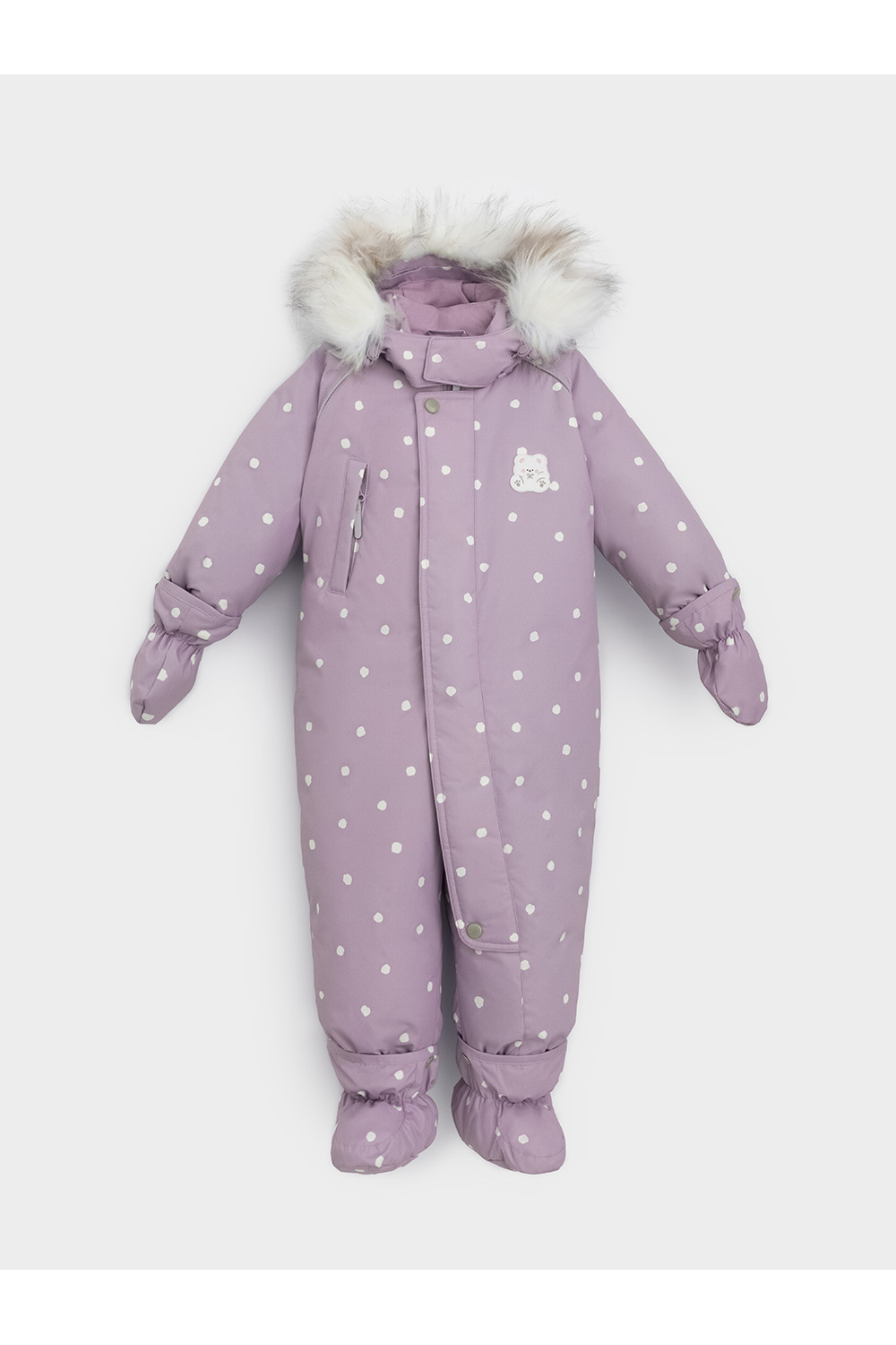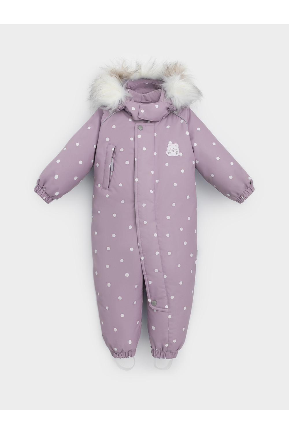 Зимний комбинезон ясельный с натуральным утеплителем из гусиного пуха (70%) и пера (30%). Выполнен из мембранной ткани с дополнительной тефлоновой обработкой, которая предохраняет изделие от загрязнений и отталкивает влагу. Подклад выполнен из 100% хлопка. Комбинезон застёгивается на молнию и внешнюю планку на липучках, предусмотрена защита подбородка. Несъёмный капюшон имеет эластичную утяжку со стопперами и отстёгивающийся мех на молнии. Резинка по спинке для лучшего прилегания. На груди карман на молнии. По рукавам и низу изделия эластичные манжеты, на ножках отстёгивающиеся силиконовые штрипки. В размерах с 68-74 по 80-86 в комплекте идут рукавицы и пинетки. Во всех изделиях верхнего ассортимента для безопасности ребёнка предусмотрены светоотражающие элементы.