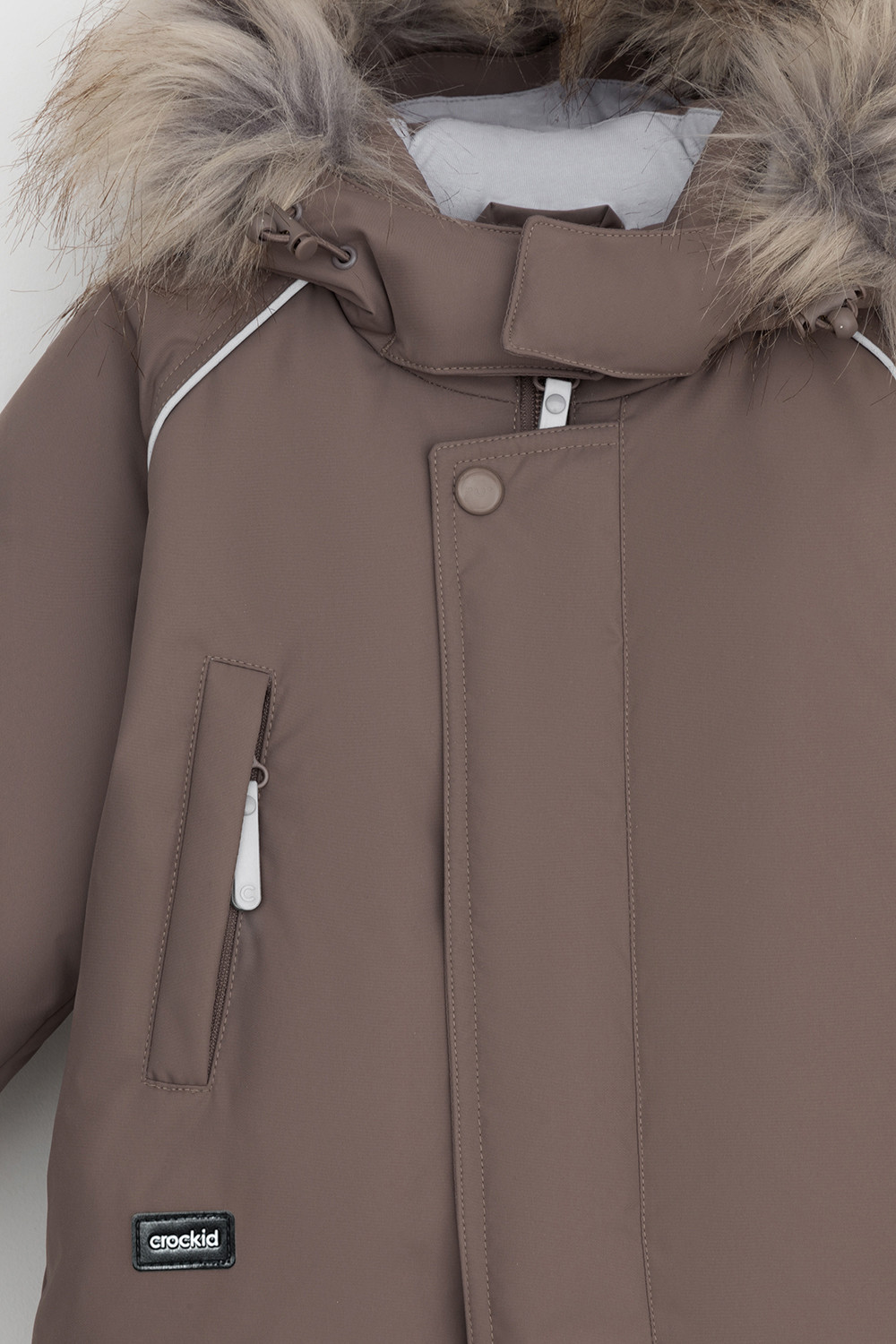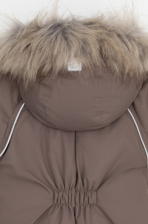 Зимний комбинезон ясельный с натуральным утеплителем из гусиного пуха (70%) и пера (30%). Выполнен из мембранной ткани с дополнительной тефлоновой обработкой, которая предохраняет изделие от загрязнений и отталкивает влагу. Подклад выполнен из 100% хлопка. Комбинезон застёгивается на молнию и внешнюю планку на липучках, предусмотрена защита подбородка. Несъёмный капюшон имеет эластичную утяжку со стопперами и отстёгивающийся мех на молнии. Резинка по спинке для лучшего прилегания. На груди карман на молнии. По рукавам и низу изделия эластичные манжеты, на ножках отстёгивающиеся силиконовые штрипки. В размерах с 68-74 по 80-86 в комплекте идут рукавицы и пинетки. Во всех изделиях верхнего ассортимента для безопасности ребёнка предусмотрены светоотражающие элементы.
