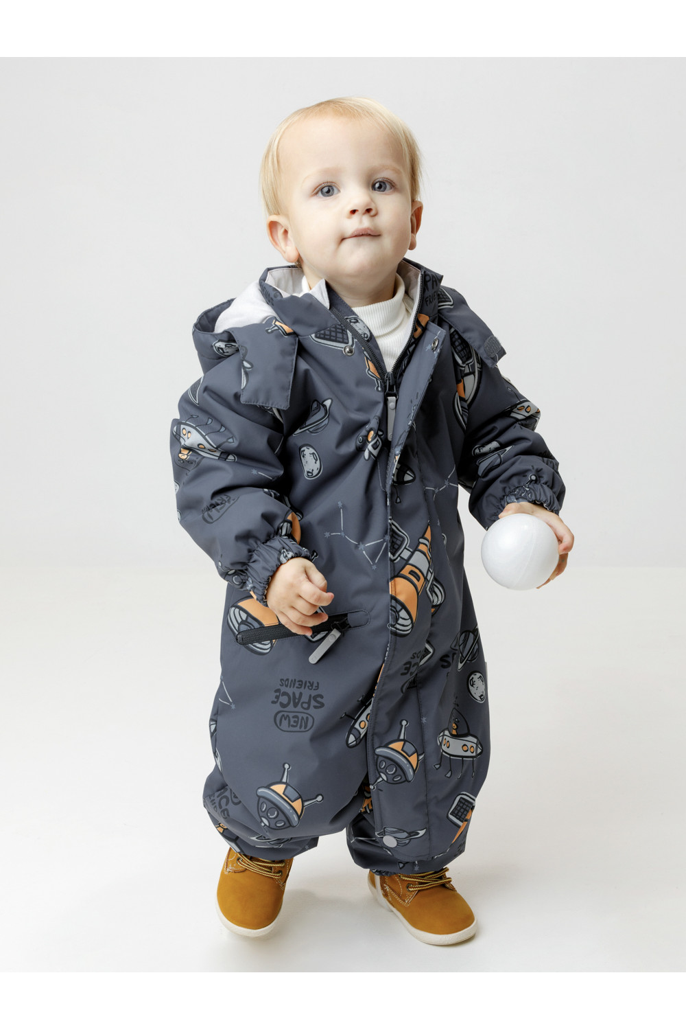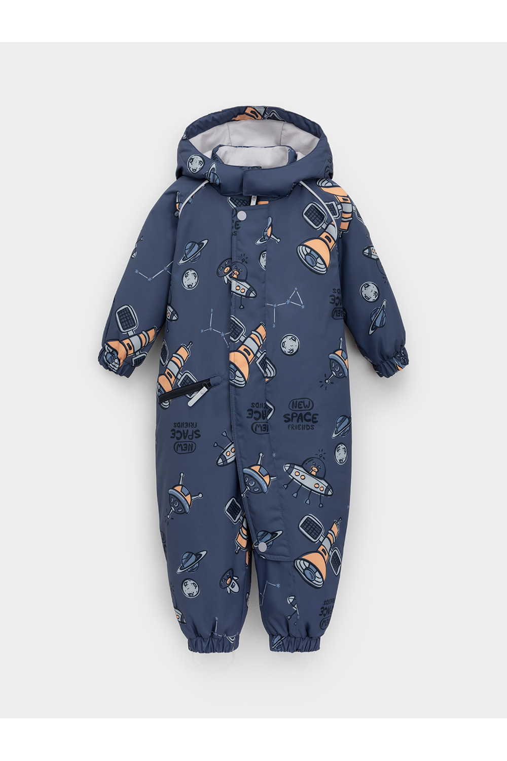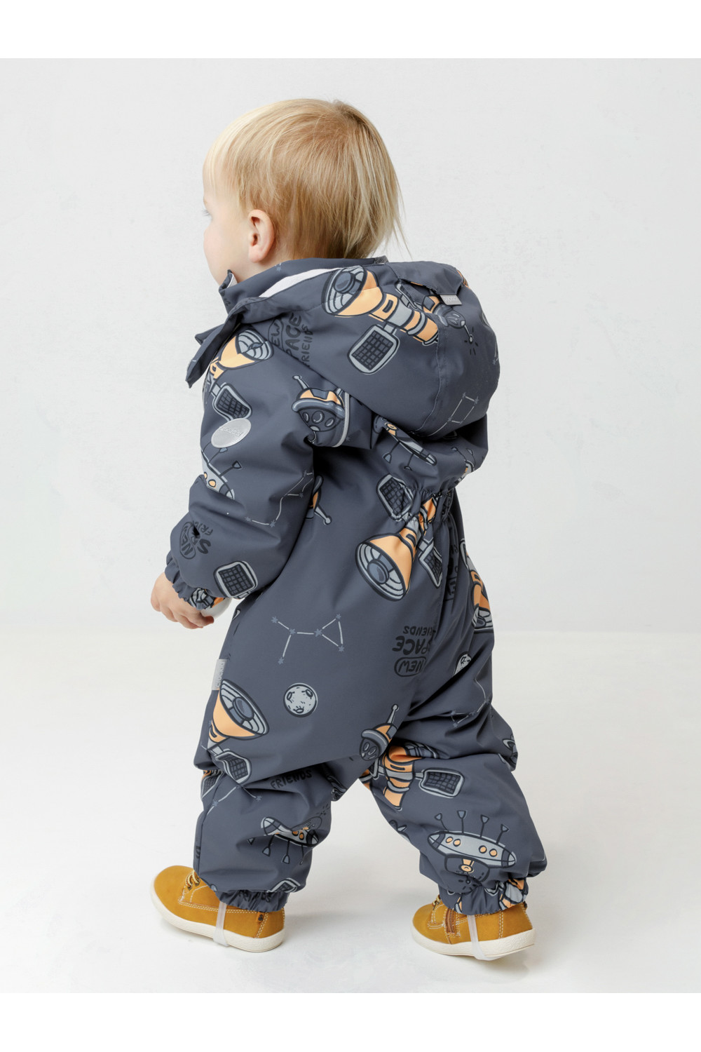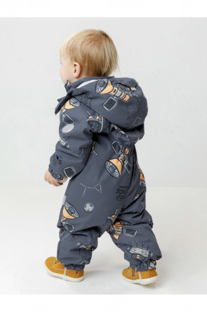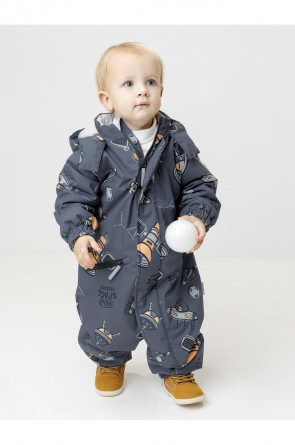 Демисезонный комбинезон ясельный с утеплителем Fellex®, 120 г/м2. Выполнен из мембранной ткани с дополнительной тефлоновой обработкой. Данный вид обработки предохраняет изделие от загрязнения и лучше отводит влагу. Подклад из 100% хлопка. Для удобного одевания комбинезон застёгивается на удлинённую молнию с защитой подбородка. Ветрозащитная планка фиксируется на липучках и кнопках. Утяжка на капюшоне с потайным стоппером. По низу рукавов и брючин, а также на спинке изделия предусмотрены эластичные резинки для лучшего прилегания. Для фиксации комбинезона используются съёмные силиконовые штрипки. В размере 74-80 есть функциональные отвороты на рукавах и брючинах. Во всех изделиях верхнего ассортимента для безопасности ребёнка предусмотрены светоотражающие элементы.