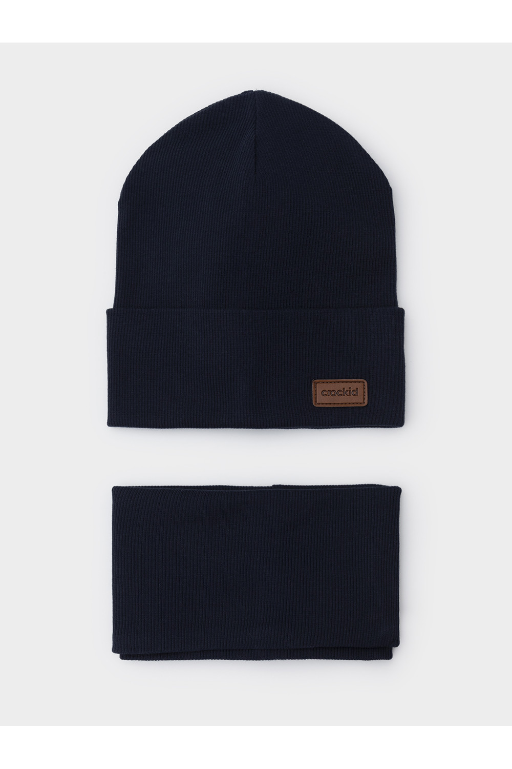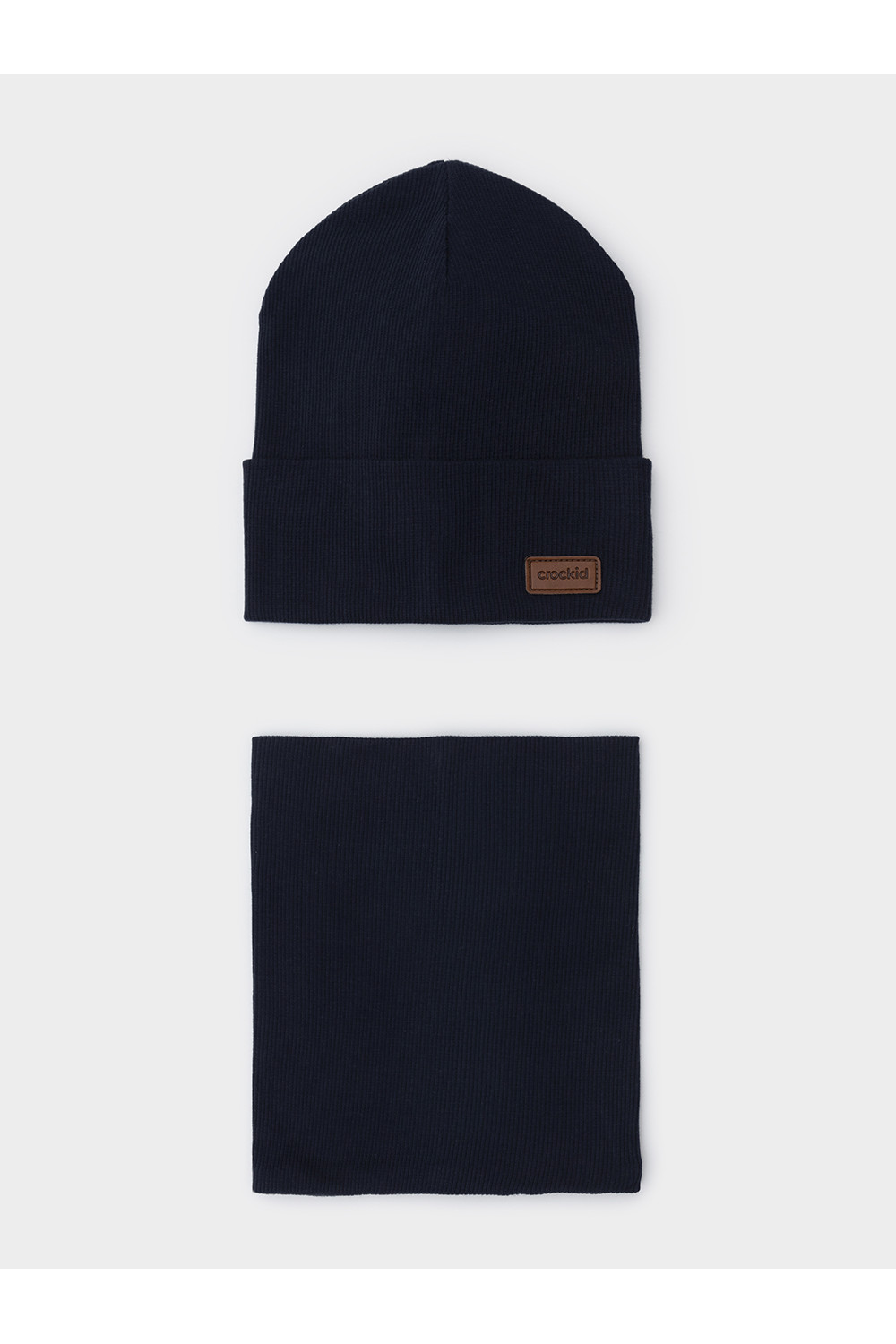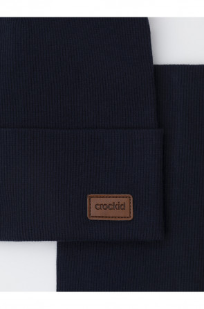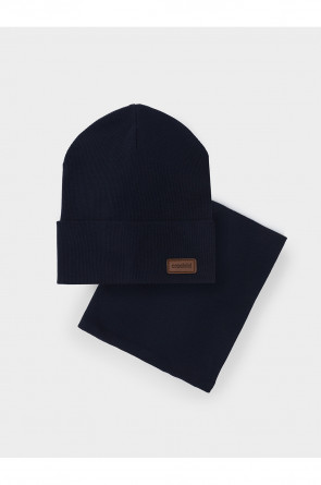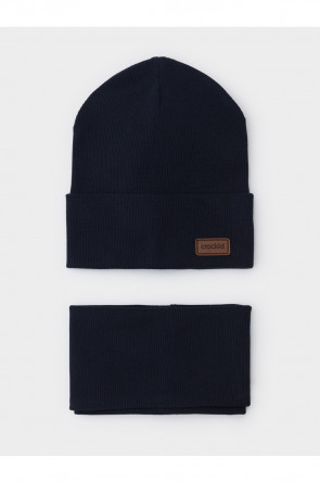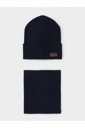 Комплект для мальчика: шапка и снуд из хлопкового трикотажа в рубчик с добавлением эластана, окрашенного стойкими гипоаллергенными текстильными красителями. Изделия хорошо тянутся, после многократных стирок сохраняют цвет и форму.