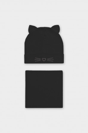 Комплект для девочки: шапка и снуд из хлопкового трикотажа с добавлением эластана, окрашенного стойкими гипоаллергенными текстильными красителями. Изделия хорошо тянутся, после многократных стирок сохраняют цвет и форму.