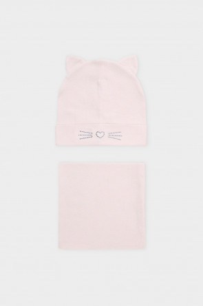 Комплект для девочки: шапка и снуд из хлопкового трикотажа с добавлением эластана, окрашенного стойкими гипоаллергенными текстильными красителями. Изделия хорошо тянутся, после многократных стирок сохраняют цвет и форму.