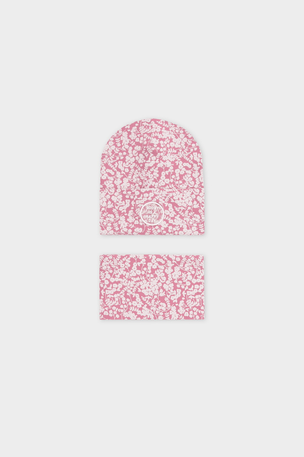 Комплект для девочки: шапка и снуд из хлопкового трикотажа в рубчик с добавлением эластана. Набивка выполнена из стойких гипоаллергенных красителей. Изделия хорошо тянутся, после многократных стирок сохраняют цвет и форму.