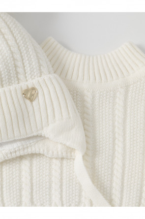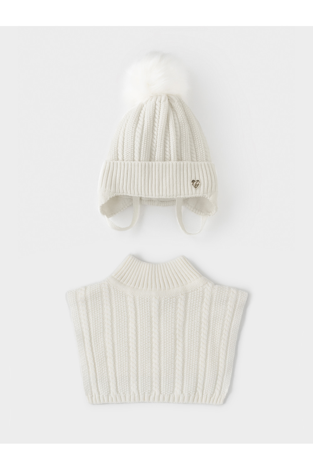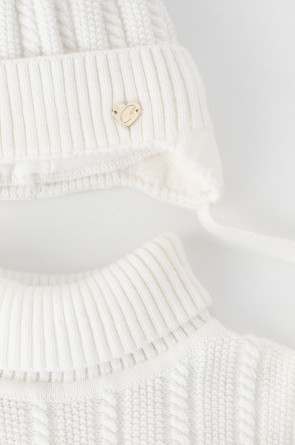 Комплект для девочки: шапка и манишка из полушерстяной пряжи. Шапка на завязках с синтепоновым утеплителем. Подклад из натурального хлопка. Полностью закрывает голову, уши и шею, защищая ребёнка от холодного воздуха и ветра. На макушке помпон. Манишка с высоким воротником с эластичным отворотом.