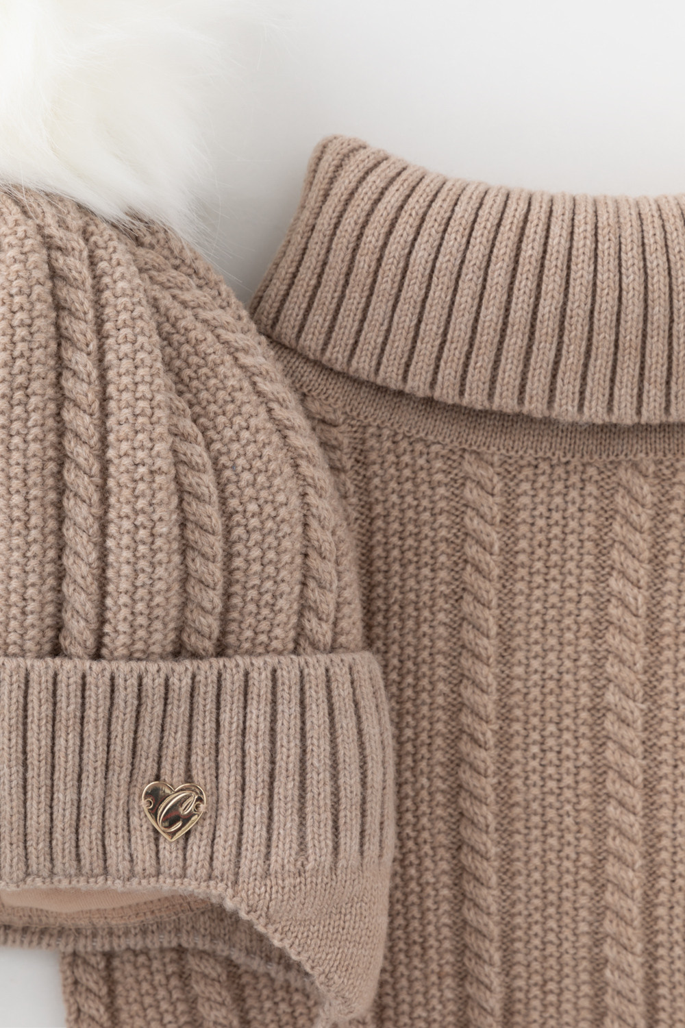 Комплект для девочки: шапка и манишка из полушерстяной пряжи. Шапка на завязках с синтепоновым утеплителем. Подклад из натурального хлопка. Полностью закрывает голову, уши и шею, защищая ребёнка от холодного воздуха и ветра. На макушке помпон. Манишка с высоким воротником с эластичным отворотом.