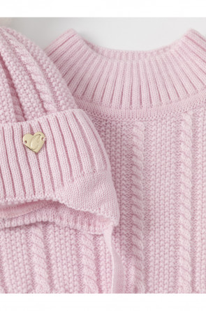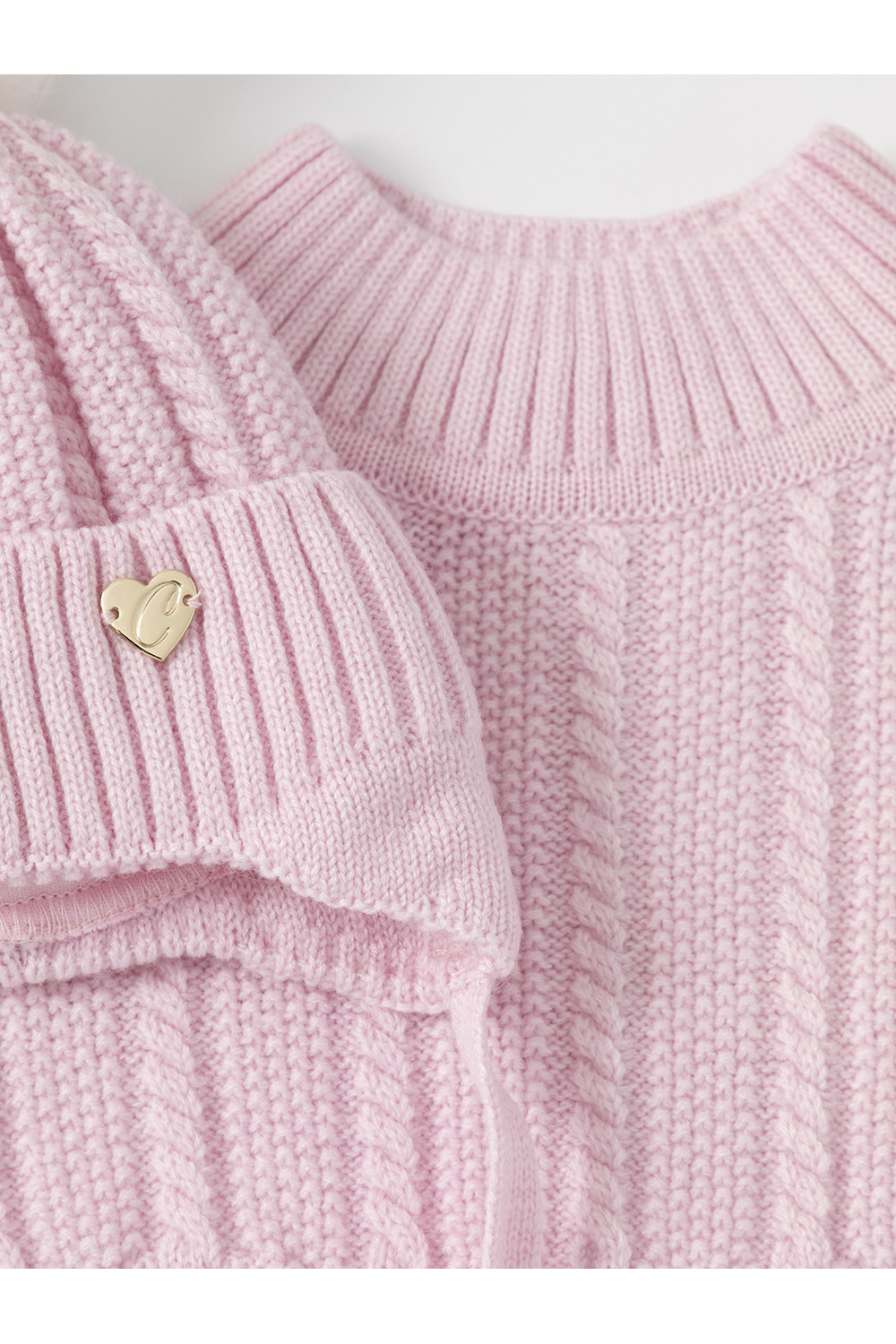 Комплект для девочки: шапка и манишка из полушерстяной пряжи. Шапка на завязках с синтепоновым утеплителем. Подклад из натурального хлопка. Полностью закрывает голову, уши и шею, защищая ребёнка от холодного воздуха и ветра. На макушке помпон. Манишка с высоким воротником с эластичным отворотом.