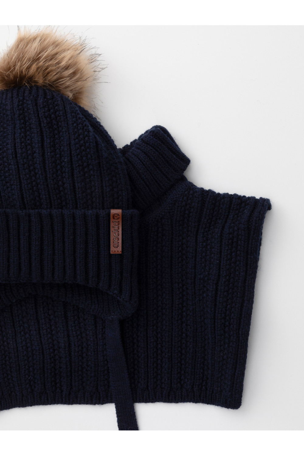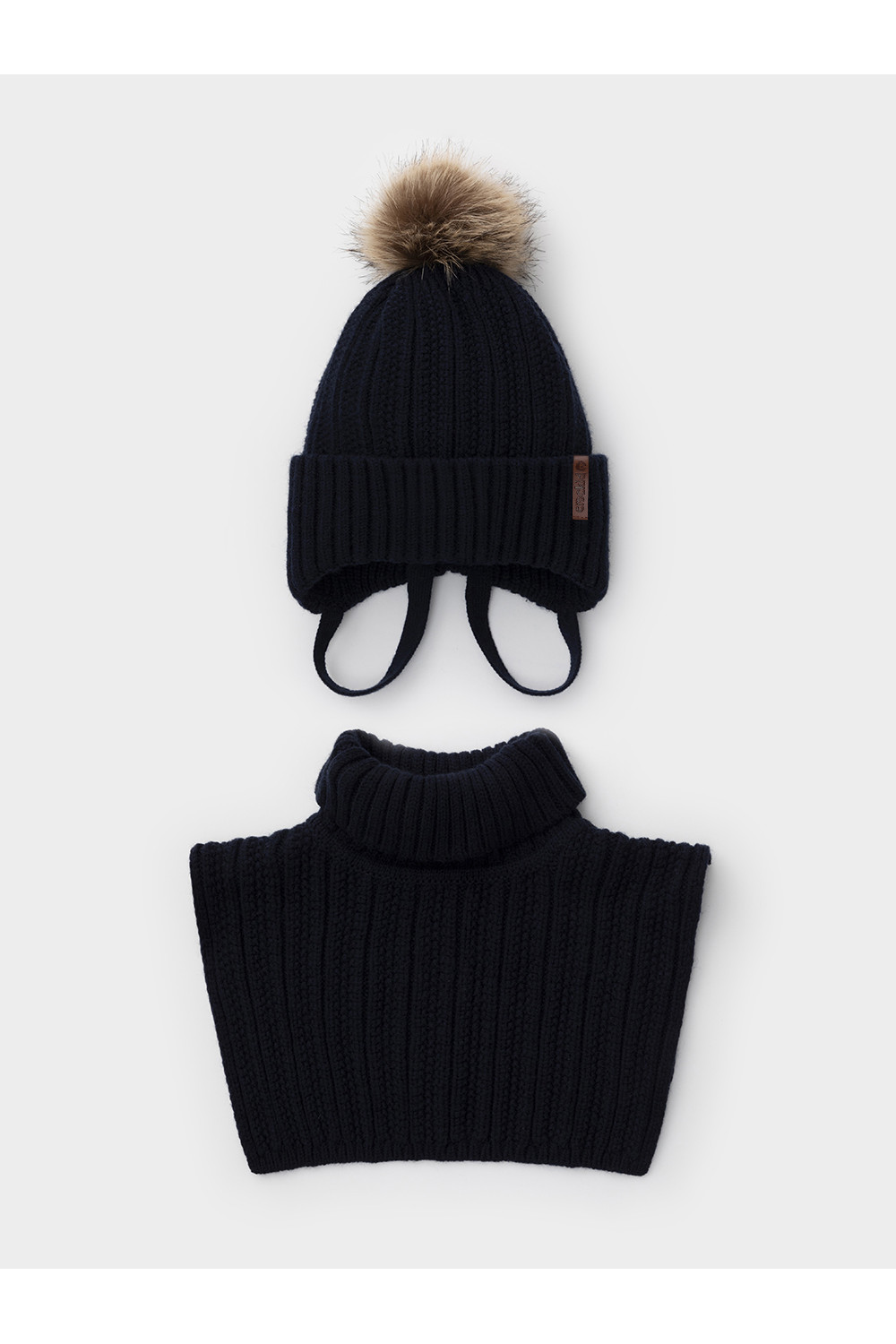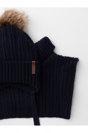 Комплект для мальчика: шапка и манишка из полушерстяной пряжи. Шапка на завязках с синтепоновым утеплителем. Подклад из натурального хлопка. Полностью закрывает голову, уши и шею, защищая ребёнка от холодного воздуха и ветра. На макушке помпон. Манишка с высоким воротником с эластичным отворотом.