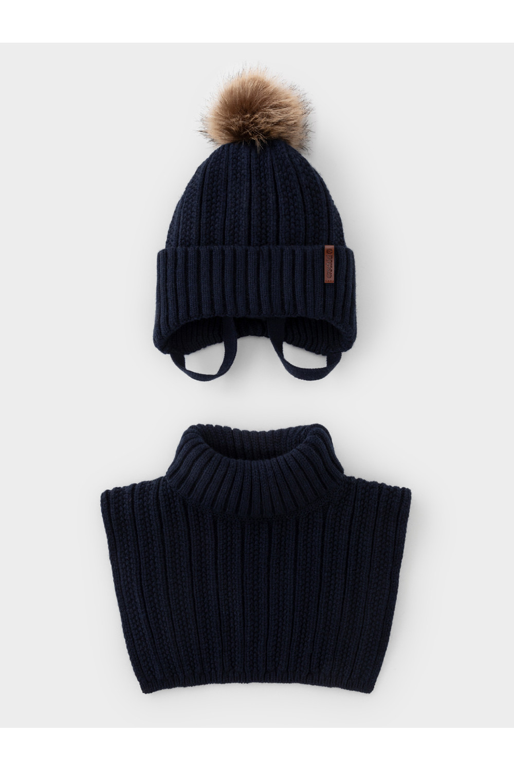 Комплект для мальчика: шапка и манишка из полушерстяной пряжи. Шапка на завязках с синтепоновым утеплителем. Подклад из натурального хлопка. Полностью закрывает голову, уши и шею, защищая ребёнка от холодного воздуха и ветра. На макушке помпон. Манишка с высоким воротником с эластичным отворотом.