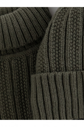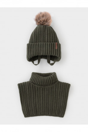 Комплект для мальчика: шапка и манишка из полушерстяной пряжи. Шапка на завязках с синтепоновым утеплителем. Подклад из натурального хлопка. Полностью закрывает голову, уши и шею, защищая ребёнка от холодного воздуха и ветра. На макушке помпон. Манишка с высоким воротником с эластичным отворотом.