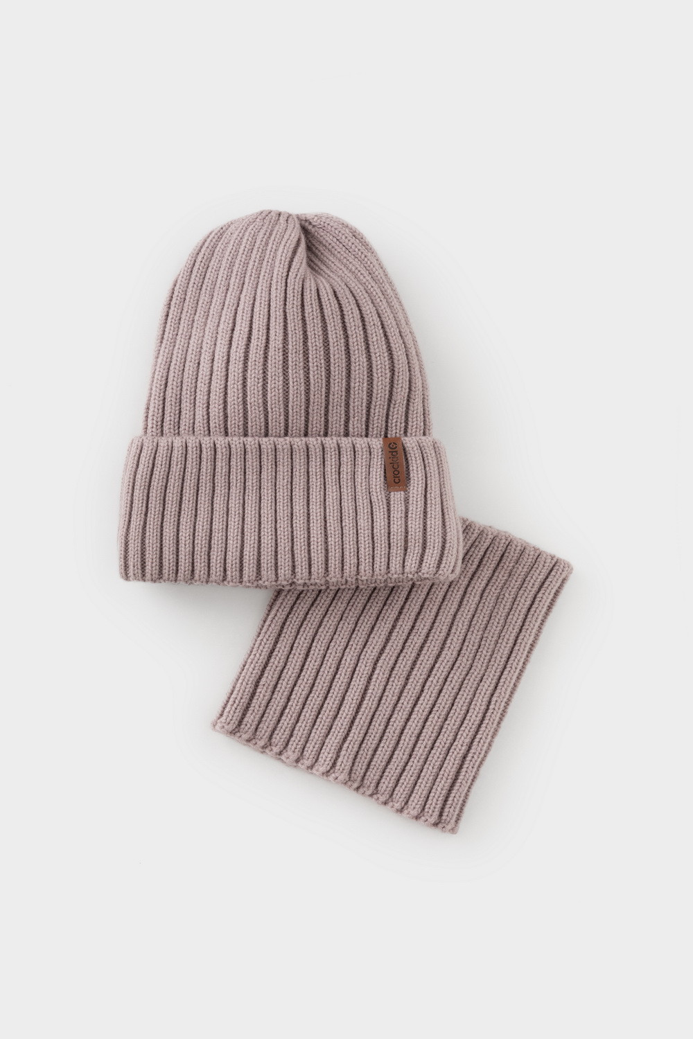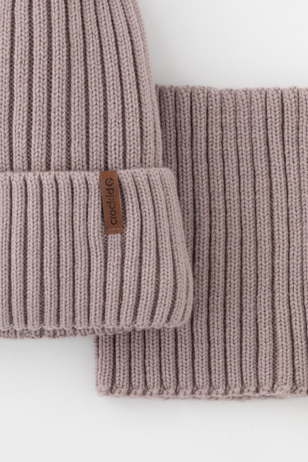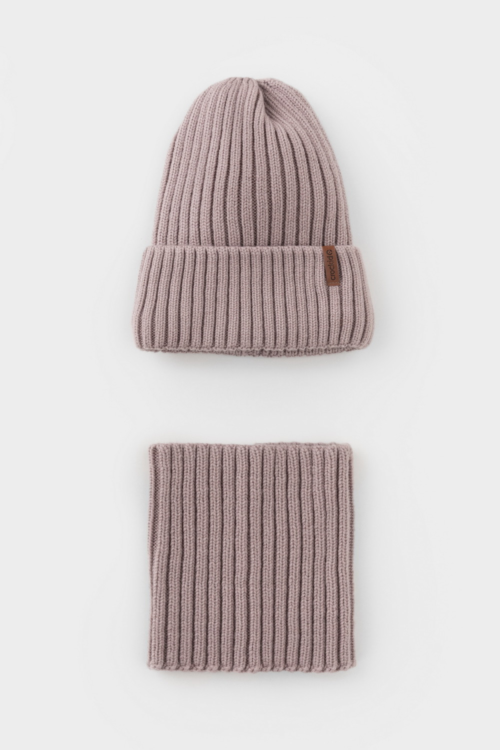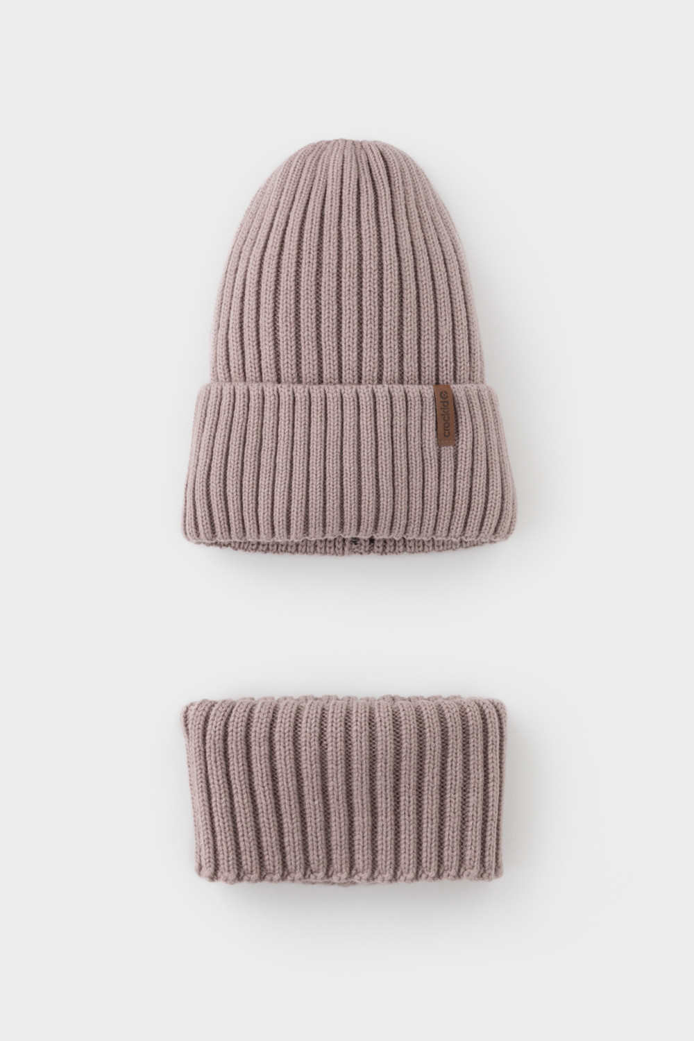 Комплект детский: шапка и снуд из полушерсти. Тёплая вязаная шапка с отворотом на подкладе из флиса. Украшена нашивкой из искусственной кожи. Узкий снуд без оборотов вокруг шеи. Изделие сохраняет форму и стойкий цвет после многочисленных стирок.