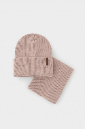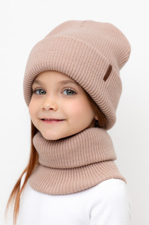 Комплект детский: шапка и снуд из полушерсти. Тёплая шапка с отворотом, украшена нашивкой из искусственной кожи. Снуд без оборотов вокруг шеи. Изделие сохраняет форму и стойкий цвет после многочисленных стирок.