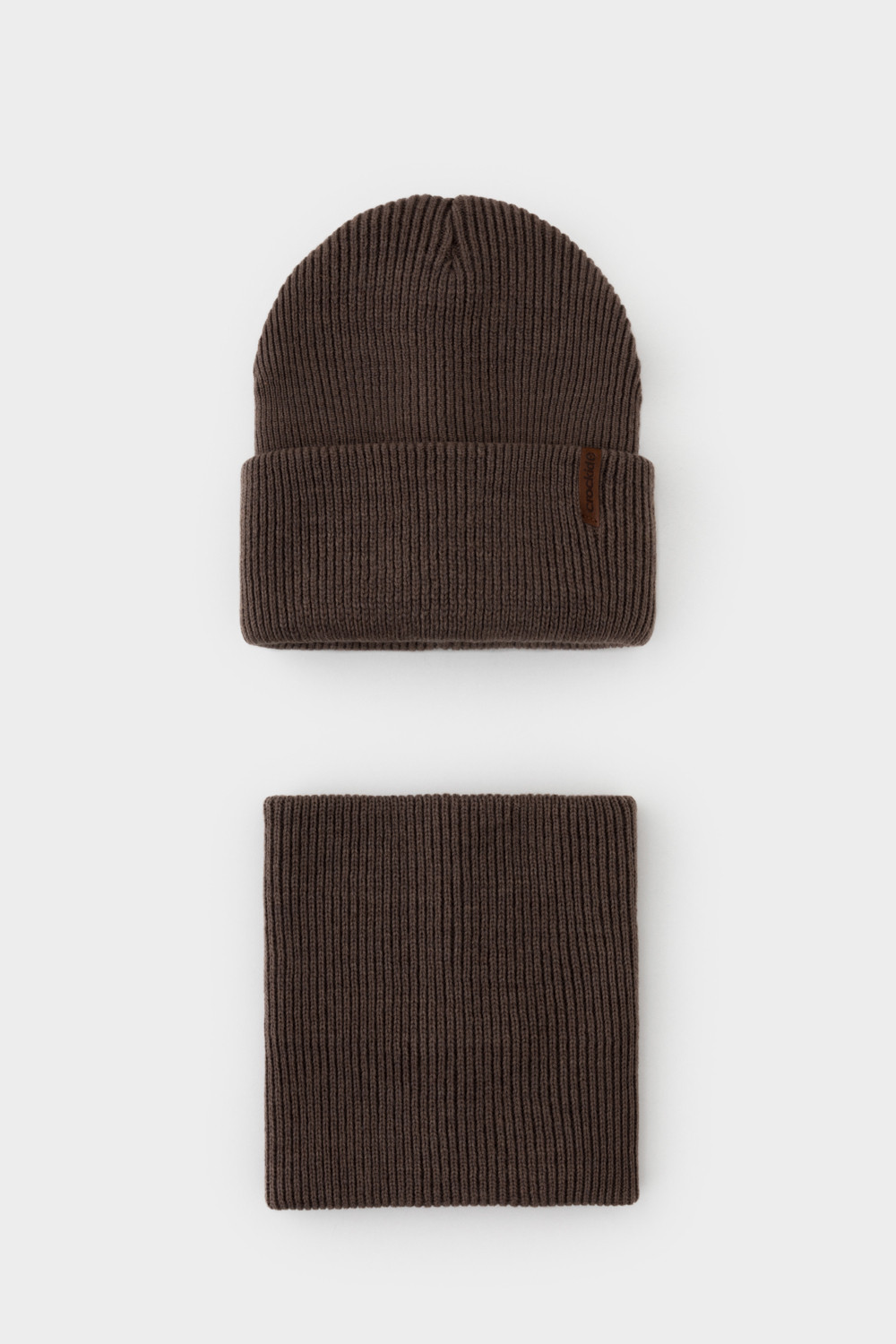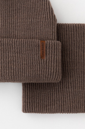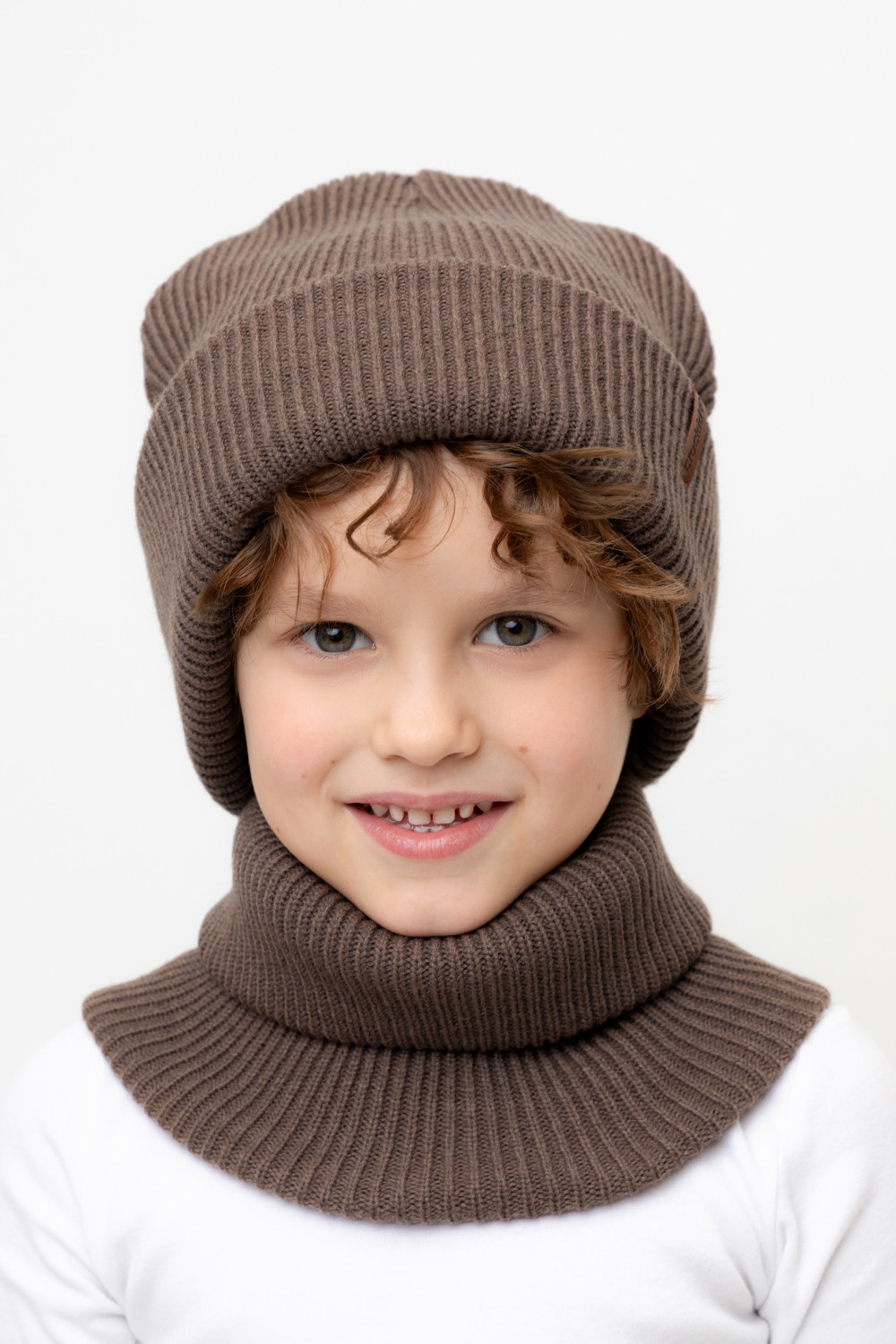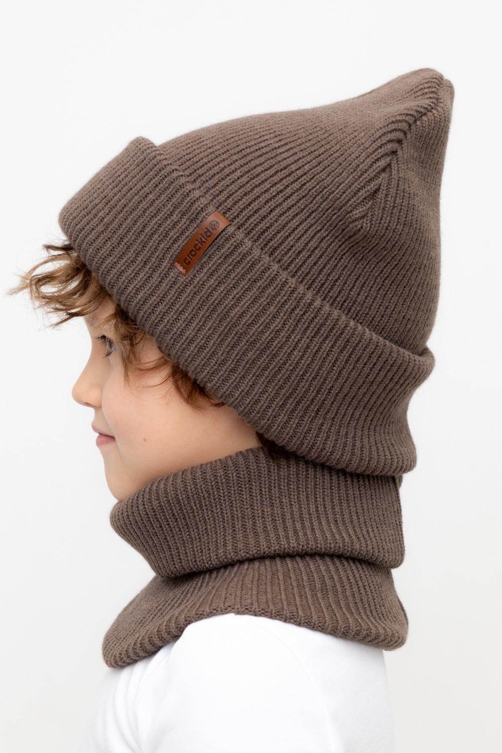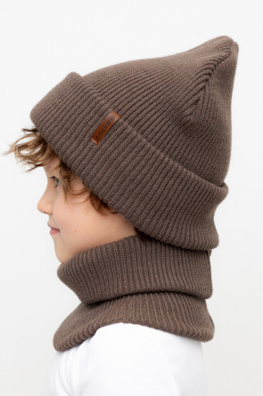 Комплект детский: шапка и снуд из полушерсти. Тёплая шапка с отворотом, украшена нашивкой из искусственной кожи. Снуд без оборотов вокруг шеи. Изделие сохраняет форму и стойкий цвет после многочисленных стирок.