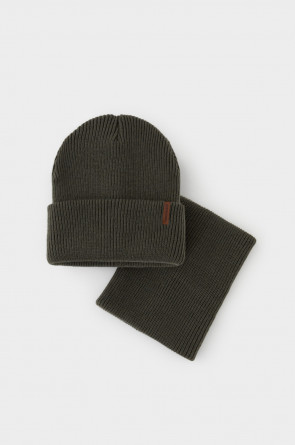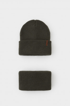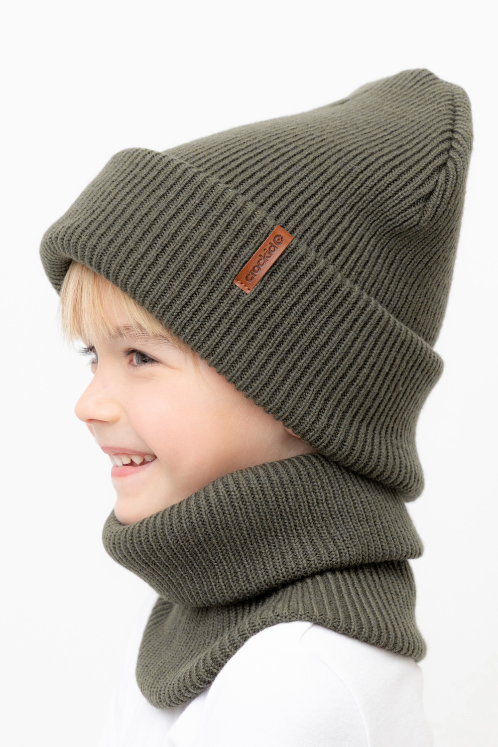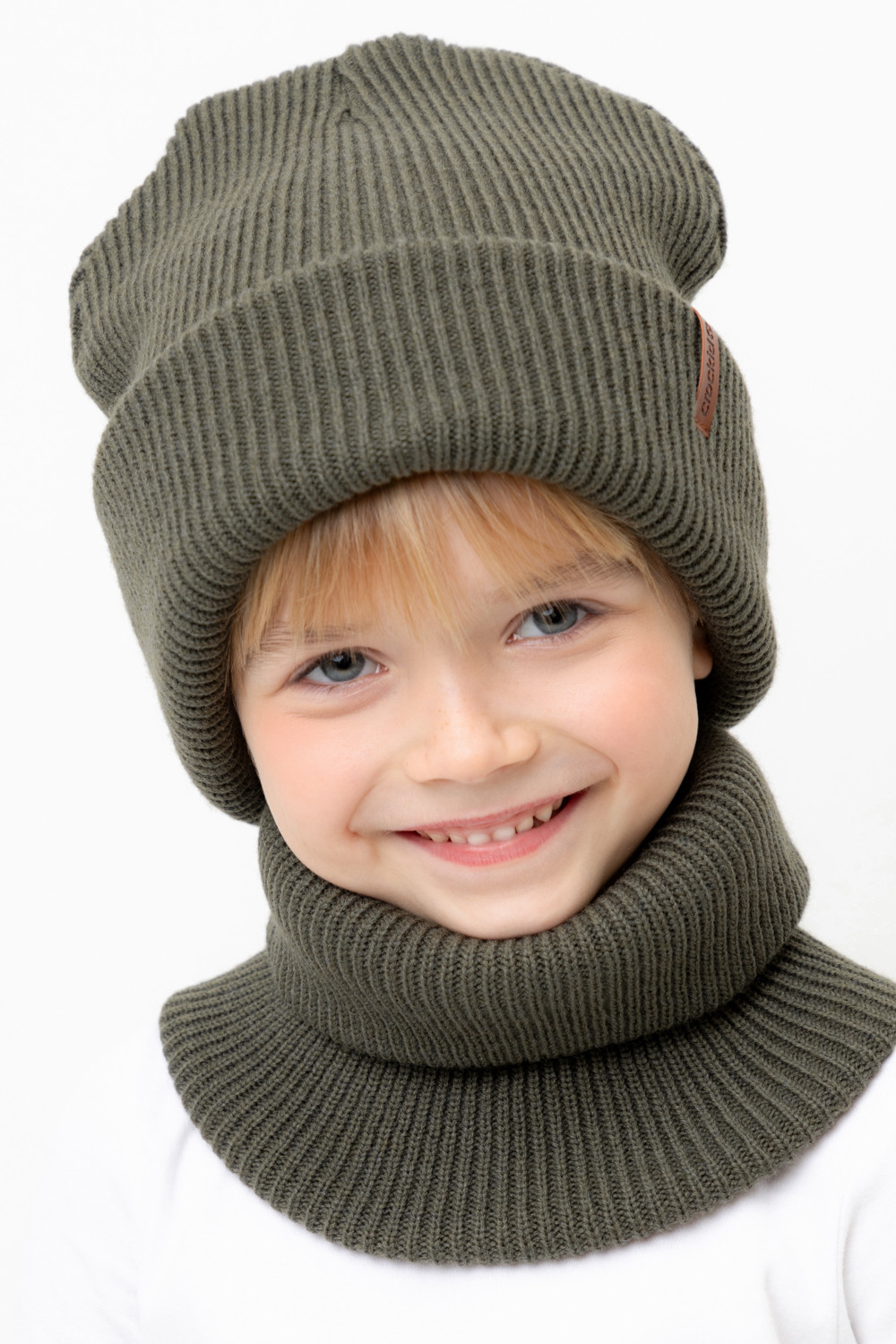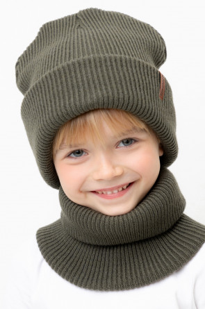 Комплект детский: шапка и снуд из полушерсти. Тёплая шапка с отворотом, украшена нашивкой из искусственной кожи. Снуд без оборотов вокруг шеи. Изделие сохраняет форму и стойкий цвет после многочисленных стирок.