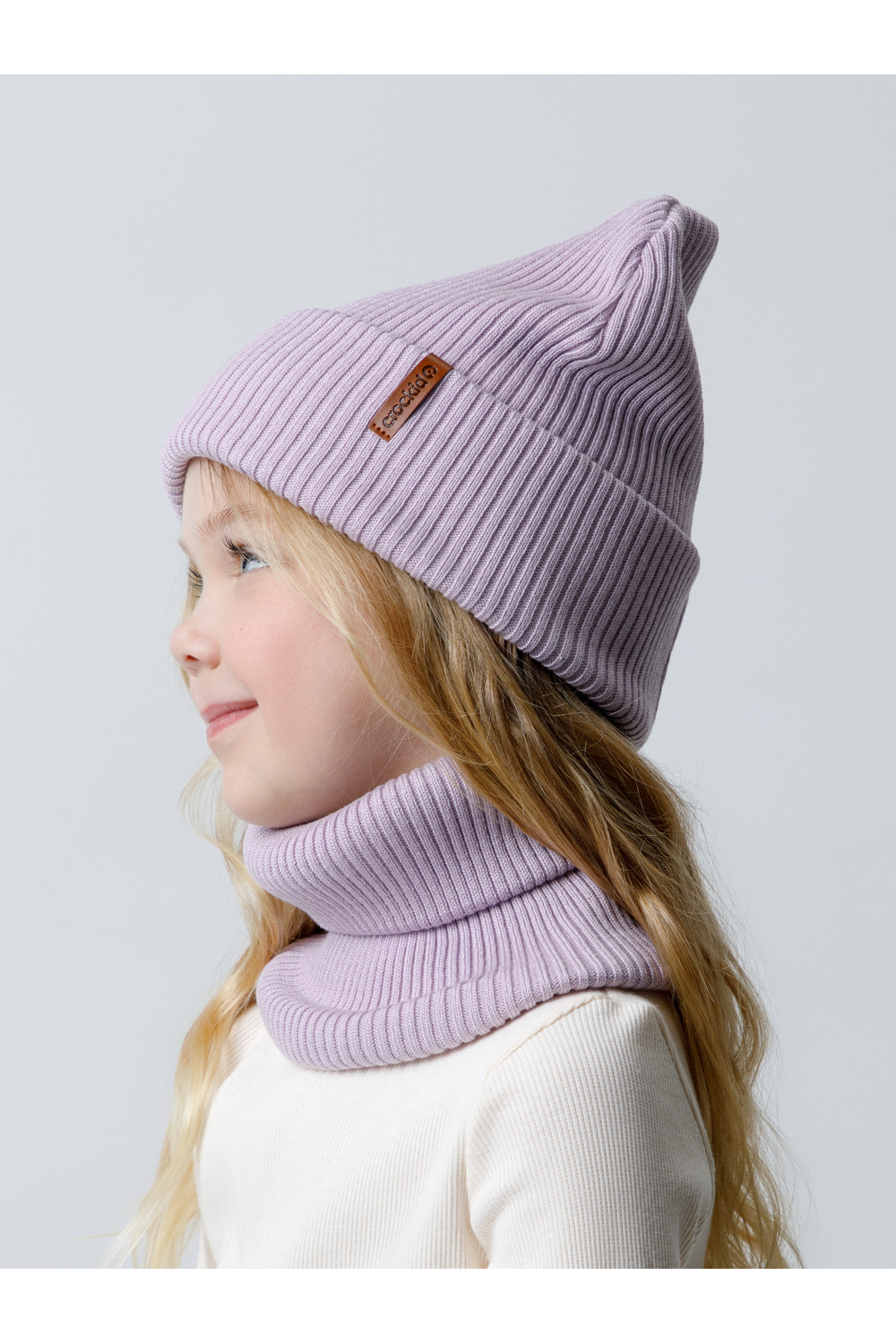 Комплект демисезонный из шапки с отворотом и снуда. Связан из высококачественного хлопка и выполнен переплетением ластик. Комфортно прилегает, обеспечивая защиту от холода и хороший теплообмен. Изделия хорошо переносят многократные стирки, сохраняя цвет и форму.