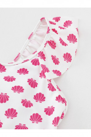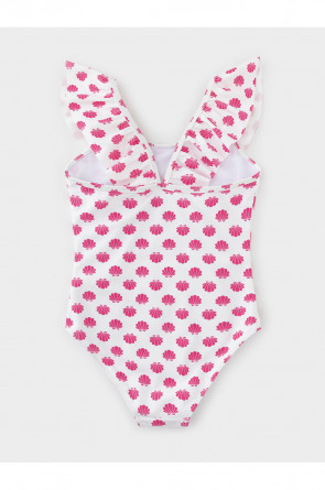 Слитный купальник на бретелях для девочки. Украшен оборками. Внутри подклад. Оригинальная набивка выполнена из стойких гипоаллергенных красителей.