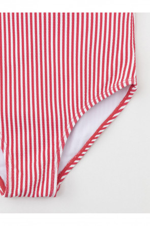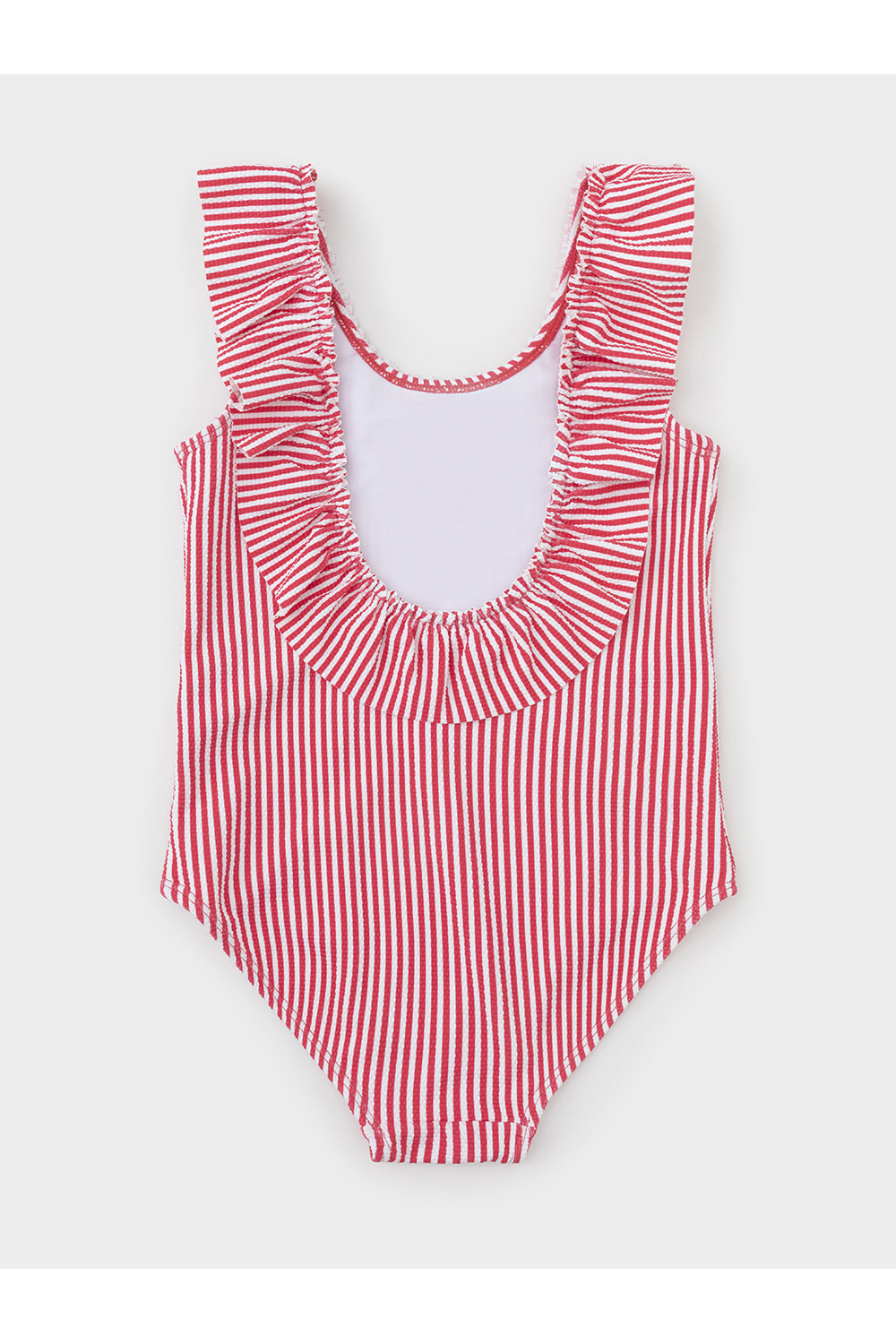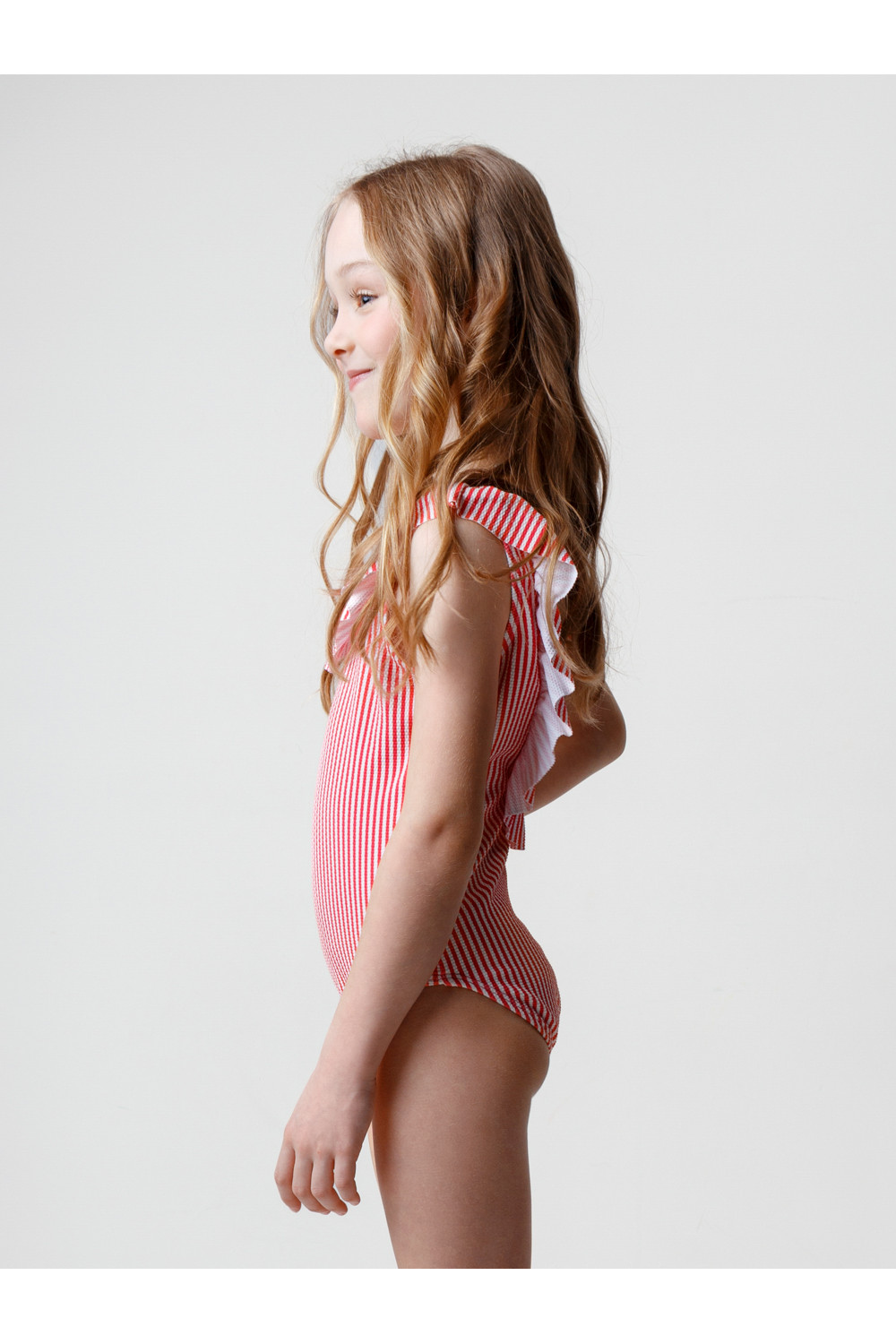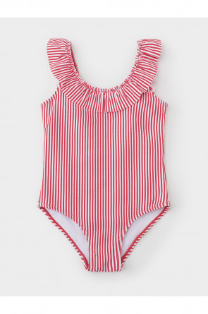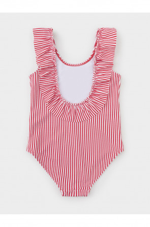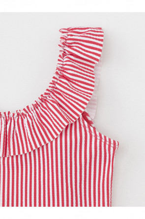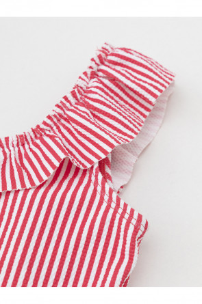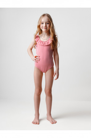 Слитный купальник на лямках для девочки. Украшен оборками. Внутри подклад. Оригинальная набивка выполнена из стойких гипоаллергенных красителей.