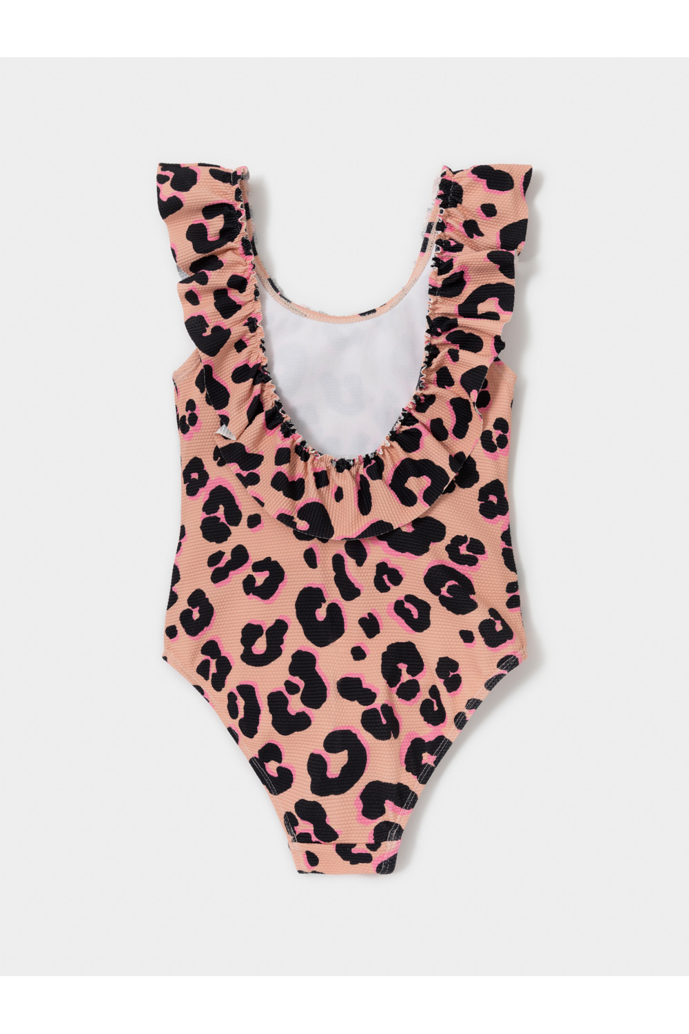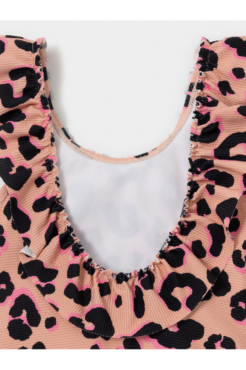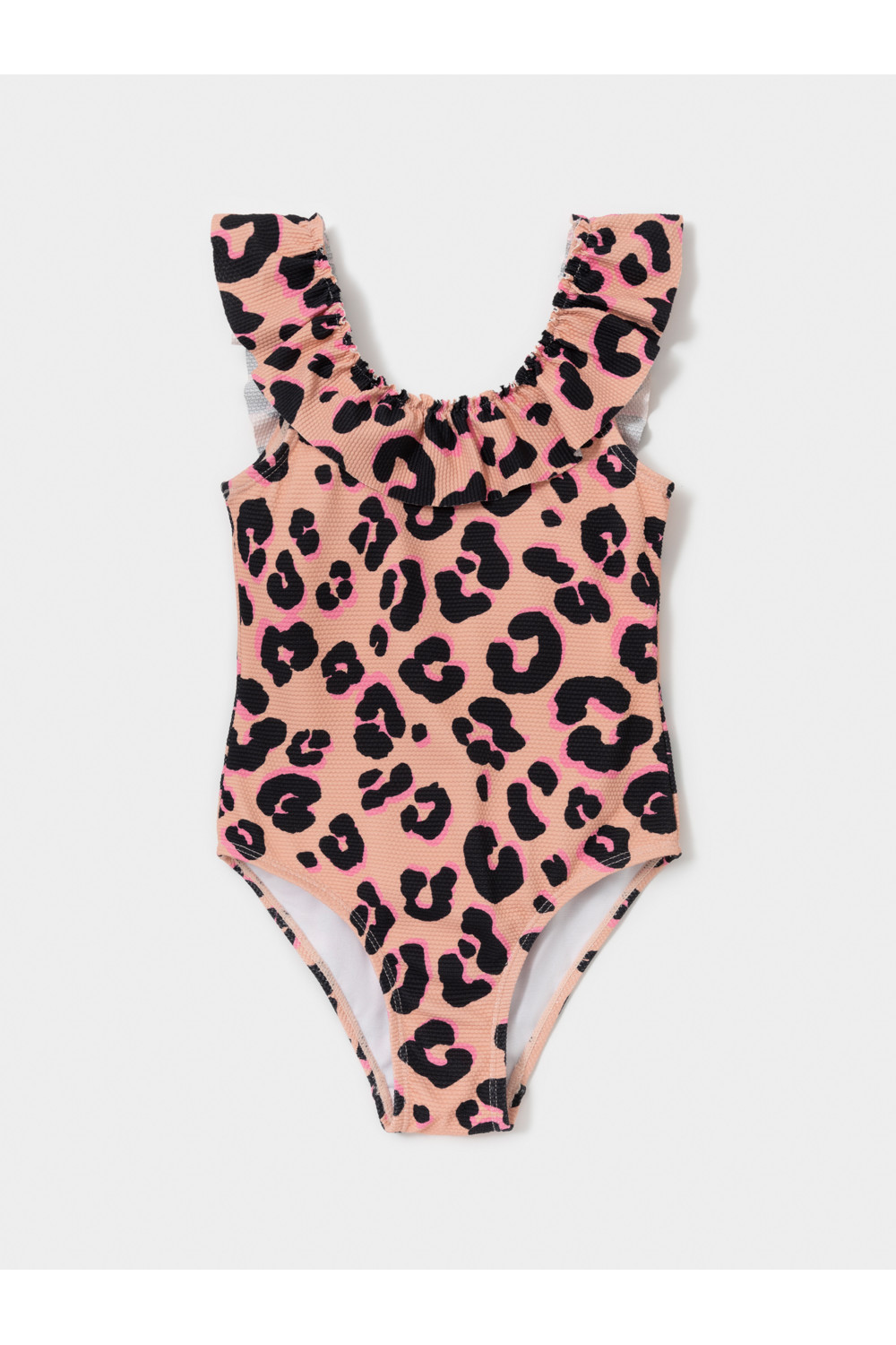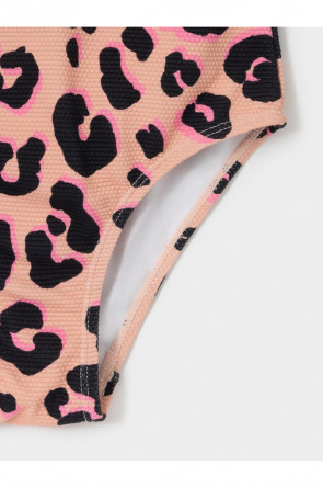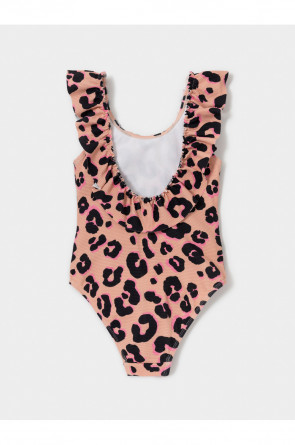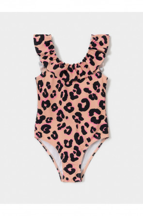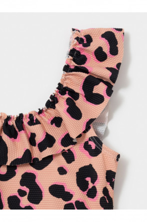 Слитный купальник на лямках из жатого материала для девочки. Внутри подклад. Верх украшен воздушными оборками. Оригинальная набивка выполнена из стойких гипоаллергенных красителей.