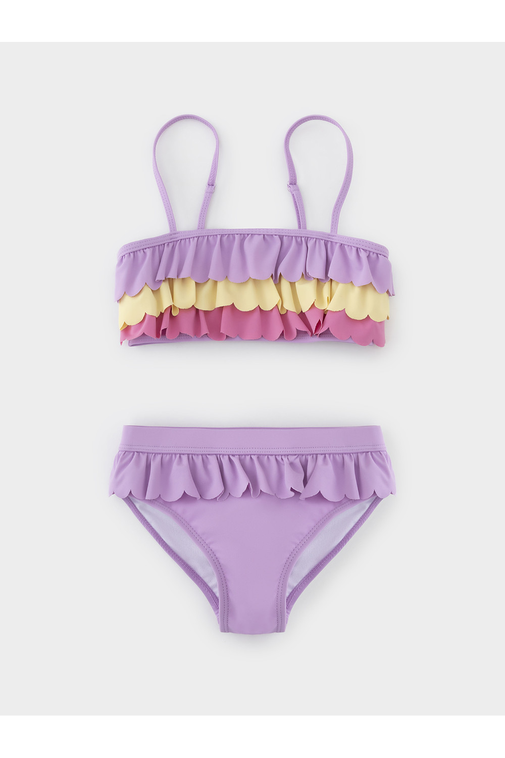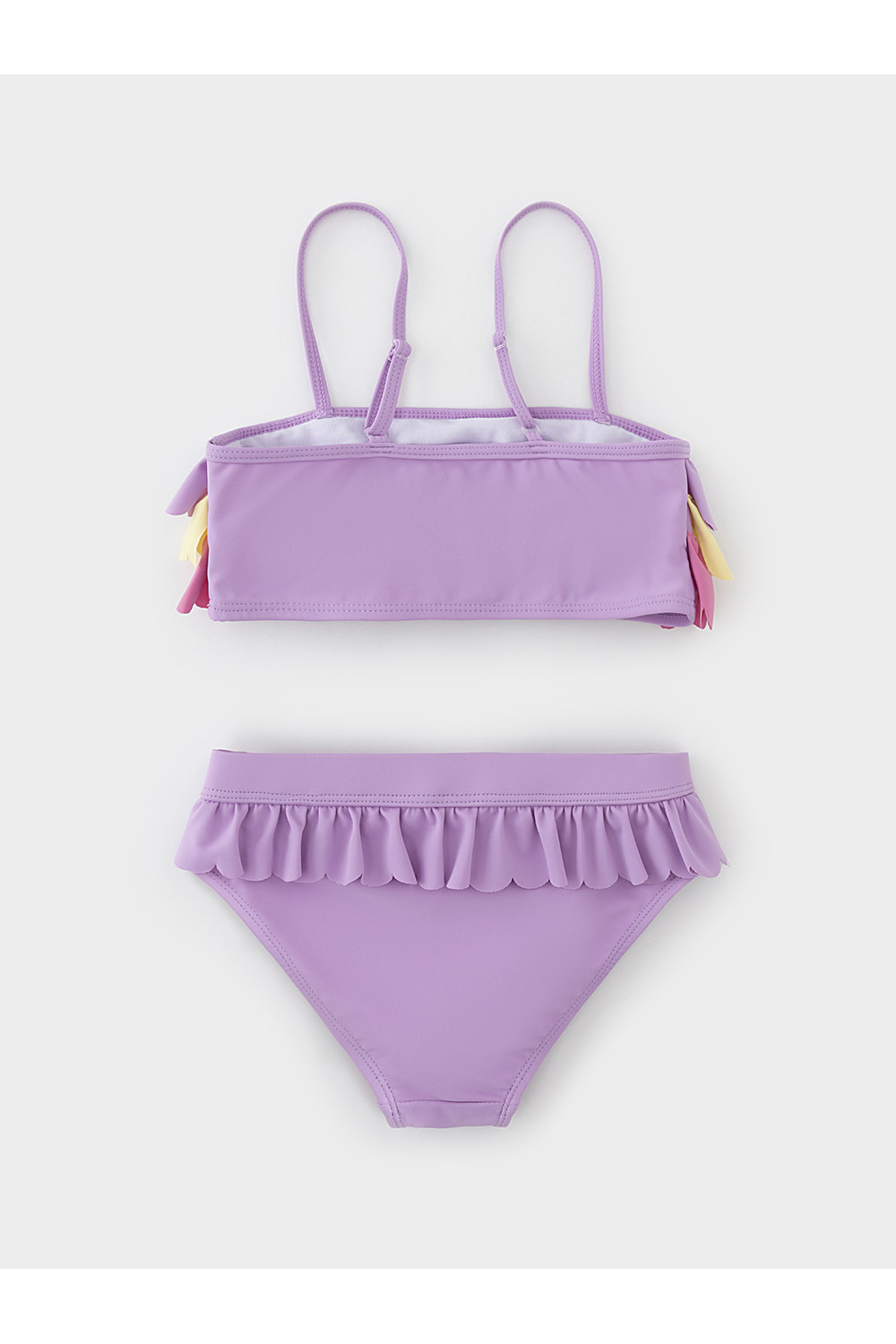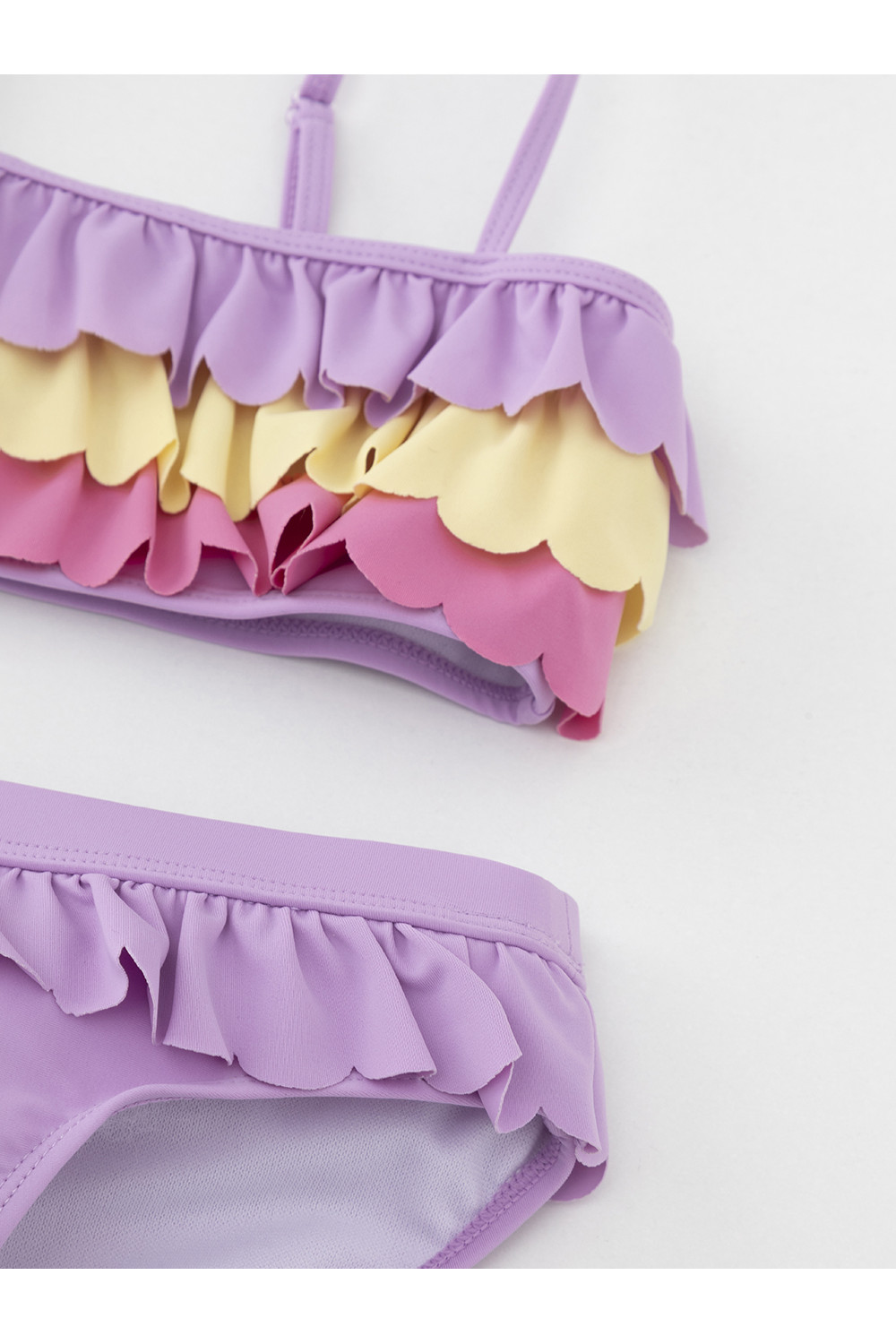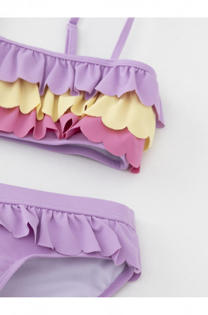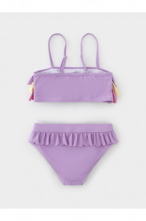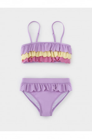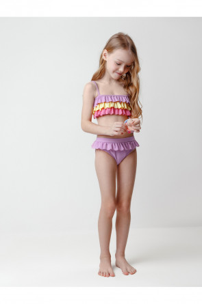 Раздельный купальник для девочки. Топ на регулируемых бретелях и плавки на эластичной резинке. Внутри подклад. Украшен воздушными оборками.