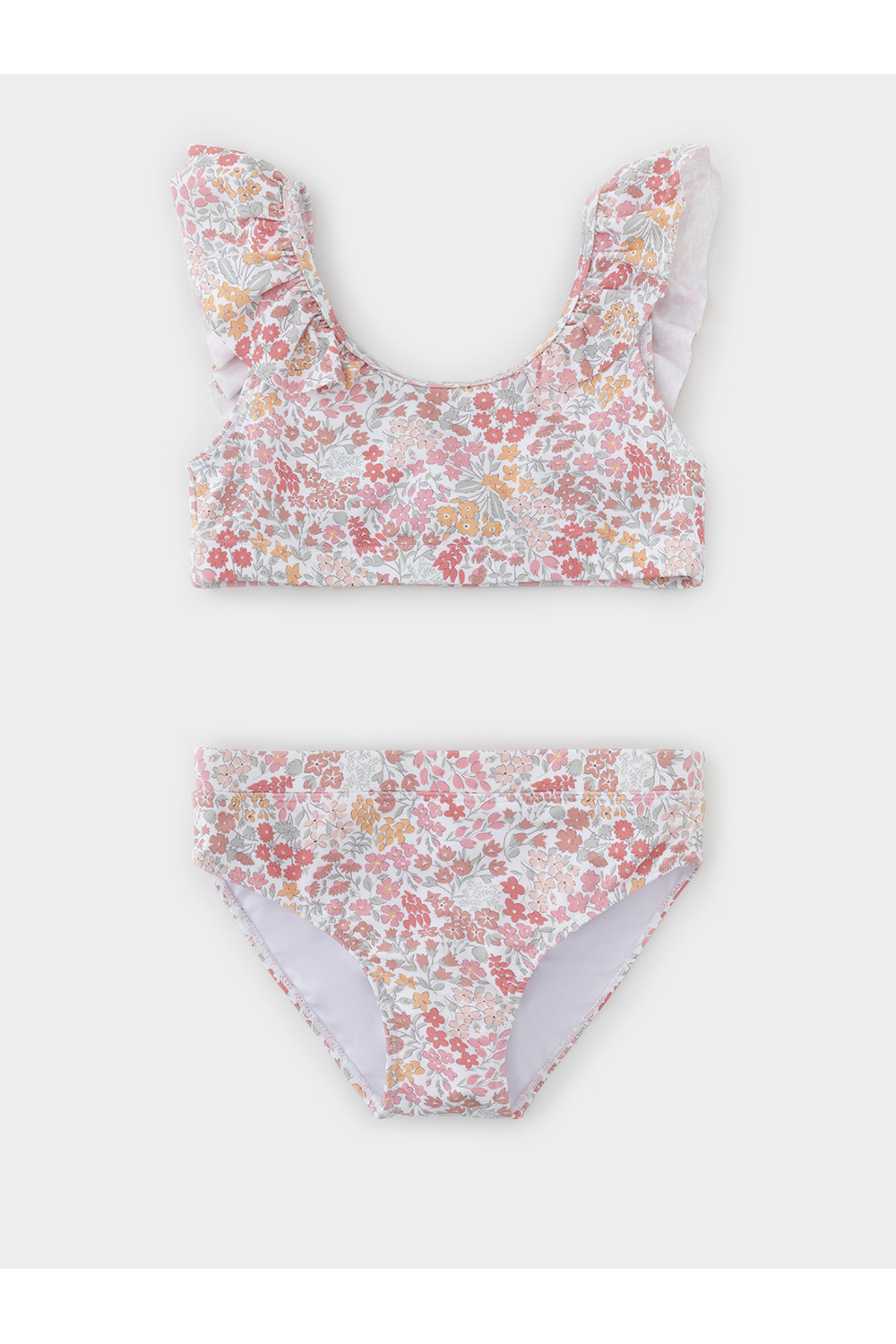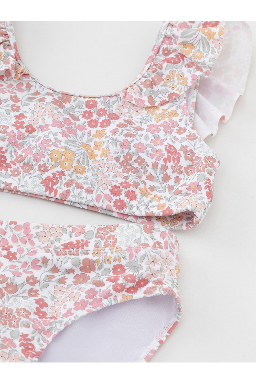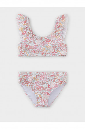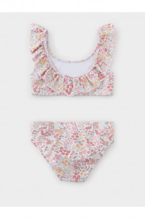 Раздельный купальник для девочки. Топ на эластичных лямках и плавки на резинке. Внутри подклад. Украшен воздушными оборками. Оригинальная набивка выполнена из стойких гипоаллергенных красителей.