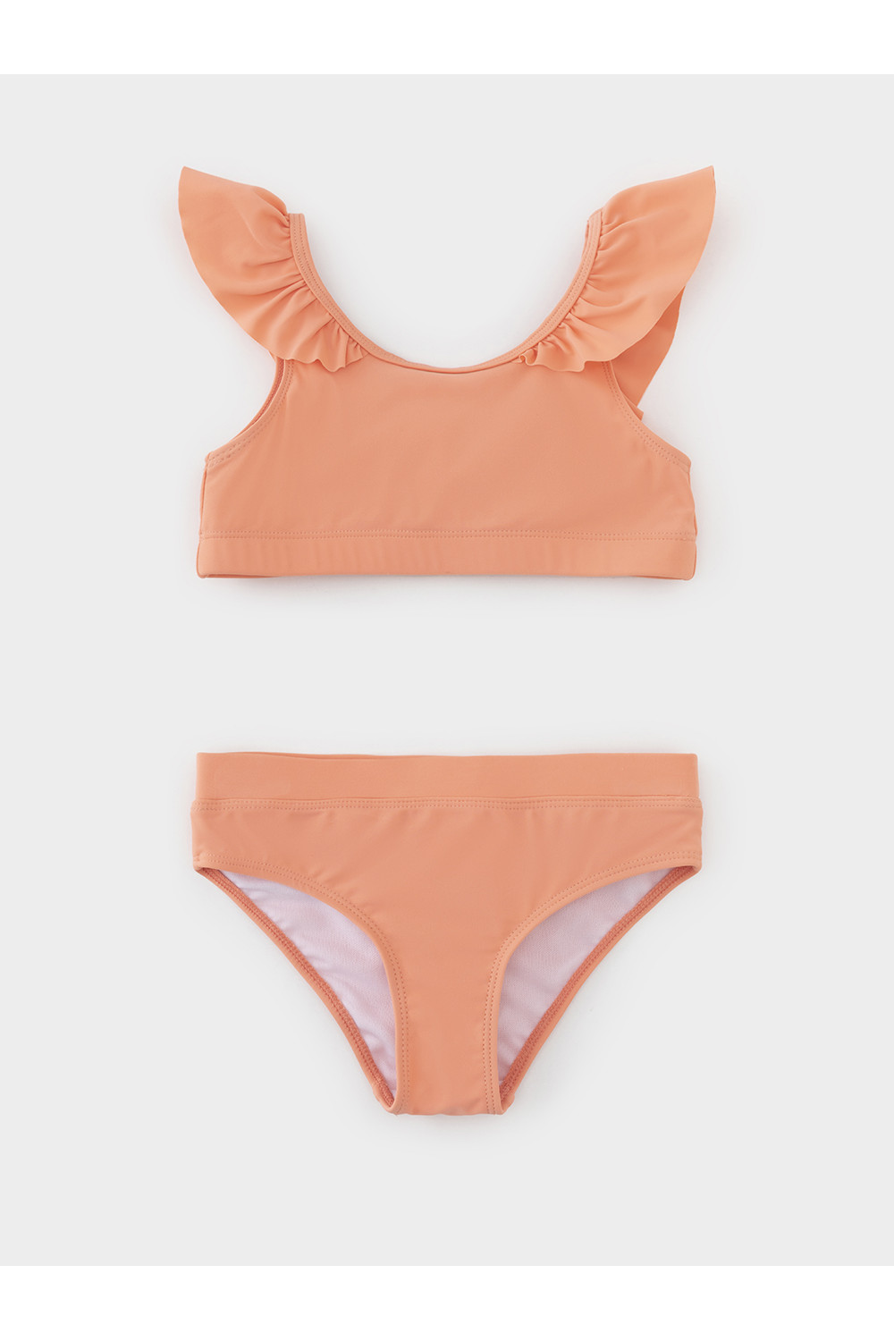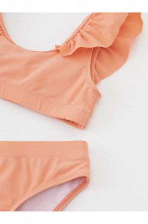 Раздельный купальник для девочки. Топ на эластичных лямках и плавки на резинке. Внутри подклад. Украшен воздушными оборками.