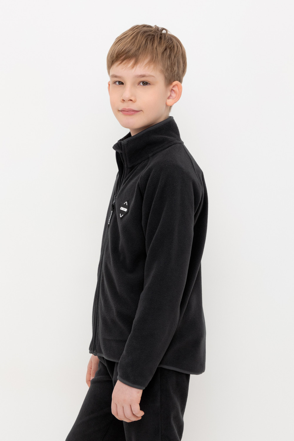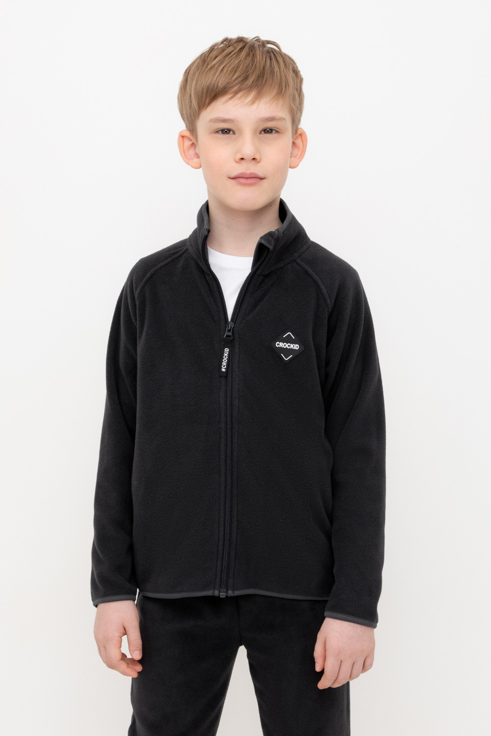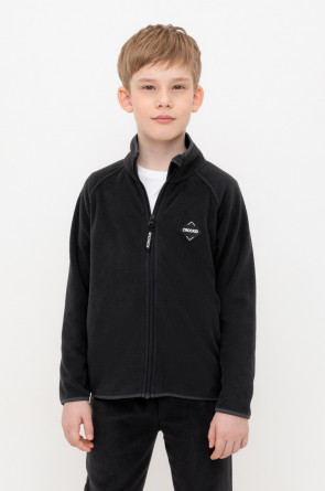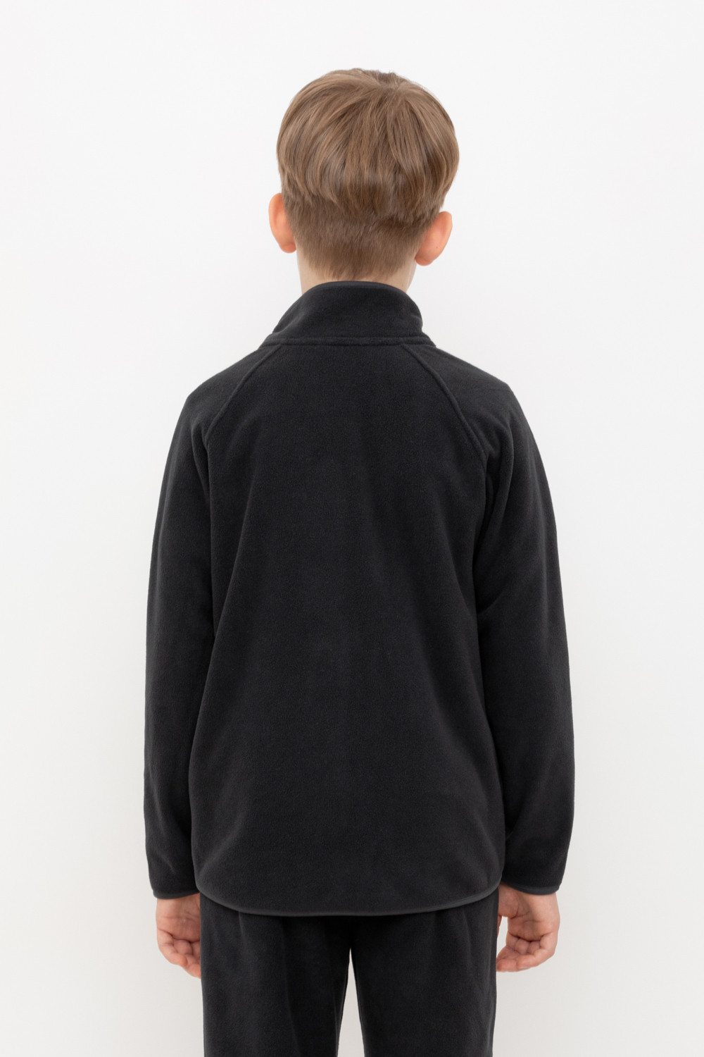 Флисовая куртка для мальчика. У изделия удлинённая спинка, высокий воротник, предусмотрена защита шеи и подбородка. Рукава-реглан и низ изделия обработаны эластичным кантом для лучшего прилегания к телу, по бокам два кармана. Куртка сохраняет цвет и форму после многократных стирок.