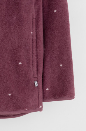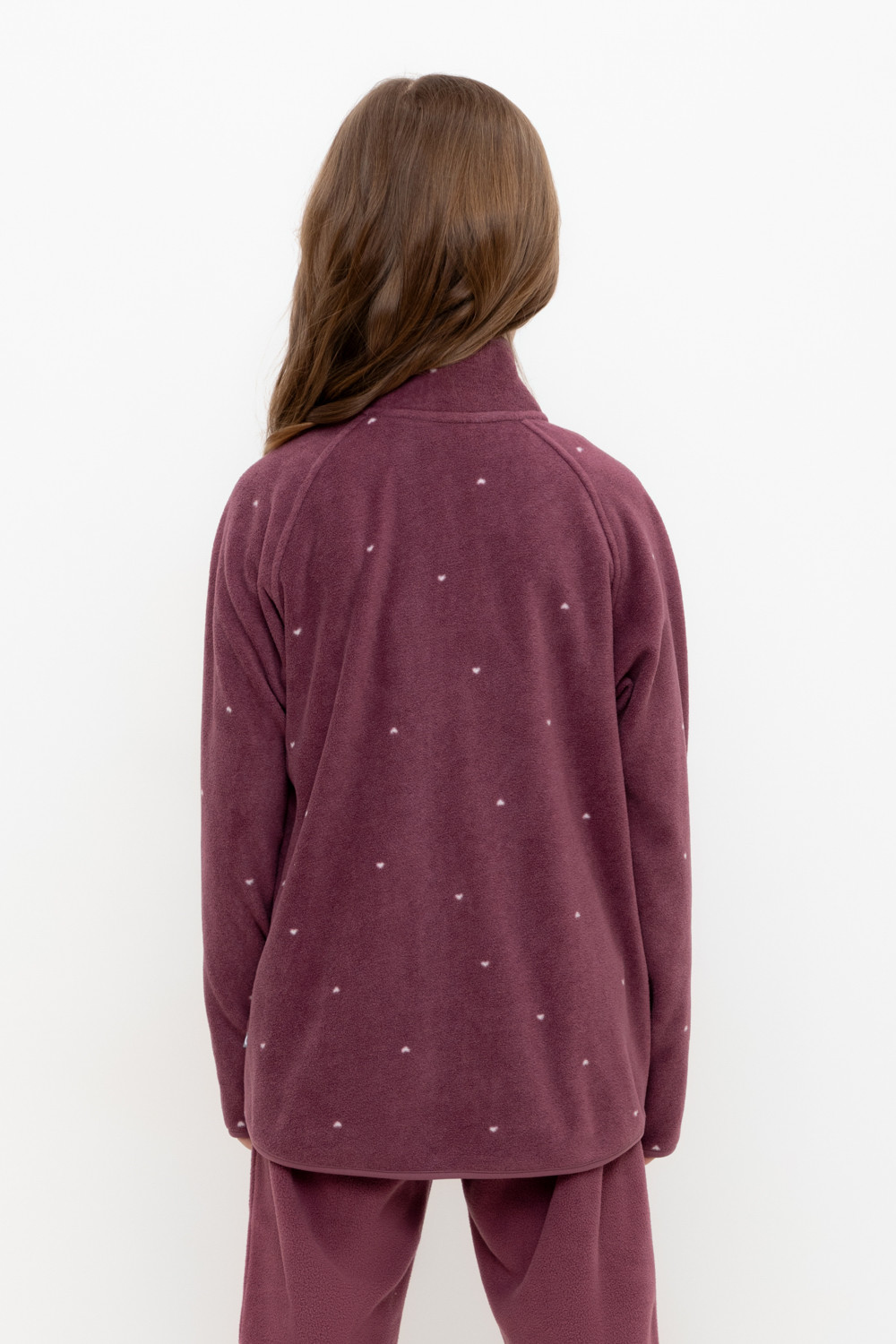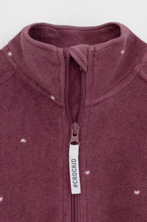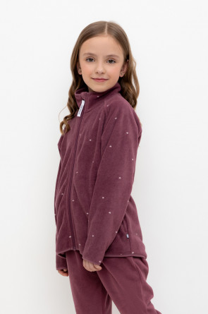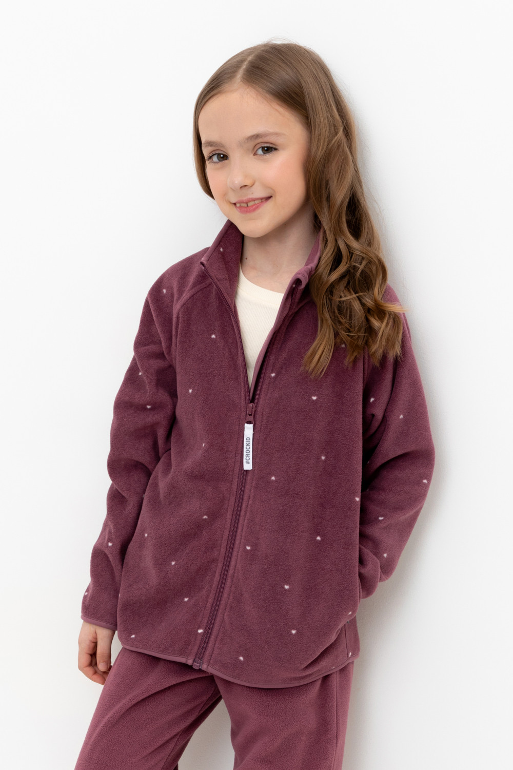 Флисовая куртка для девочки. У изделия удлинённая спинка, высокий воротник, предусмотрена защита шеи и подбородка. Рукава-реглан и низ изделия обработаны эластичным кантом для лучшего прилегания к телу, по бокам два кармана. Оригинальная набивка выполнена из стойких, гипоаллергенных текстильных красителей. Куртка сохраняет цвет и форму после многократных стирок.