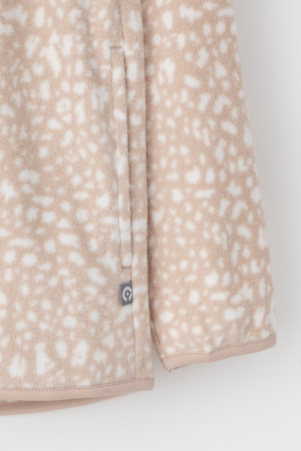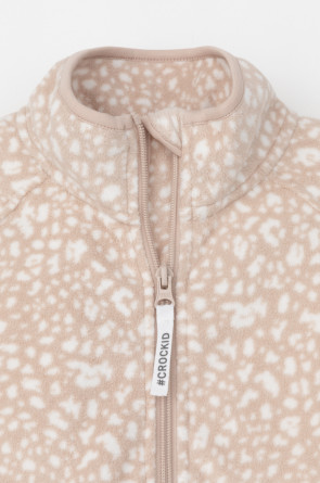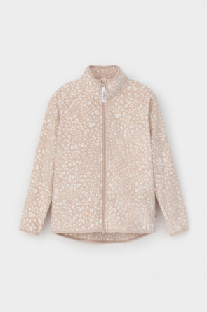Флисовая куртка для девочки. У изделия удлинённая спинка, высокий воротник, предусмотрена защита шеи и подбородка. Рукава-реглан и низ изделия обработаны эластичным кантом для лучшего прилегания к телу, по бокам два кармана. Оригинальная набивка выполнена из стойких, гипоаллергенных текстильных красителей. Куртка сохраняет цвет и форму после многократных стирок.