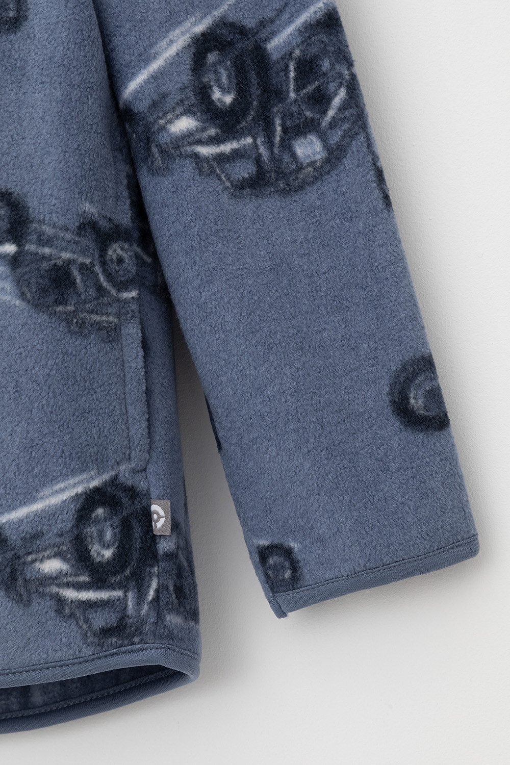 Флисовая куртка для мальчика. У изделия удлинённая спинка, высокий воротник, предусмотрена защита шеи и подбородка. Рукава-реглан и низ изделия обработаны эластичным кантом для лучшего прилегания к телу, по бокам два кармана. Оригинальная набивка выполнена из стойких, гипоаллергенных текстильных красителей. Куртка сохраняет цвет и форму после многократных стирок.