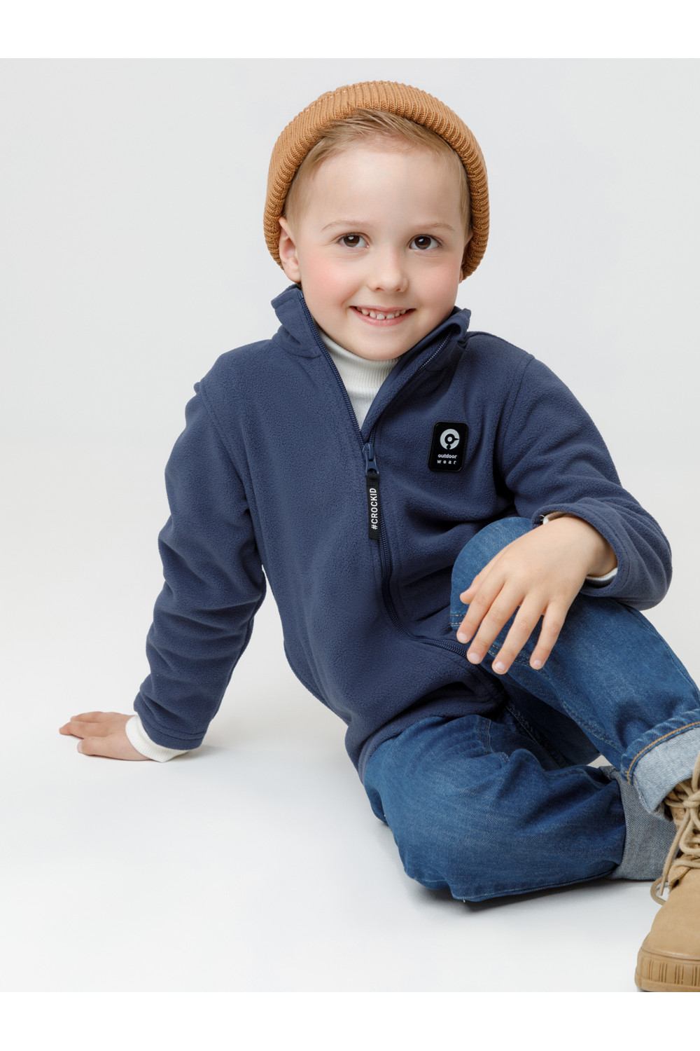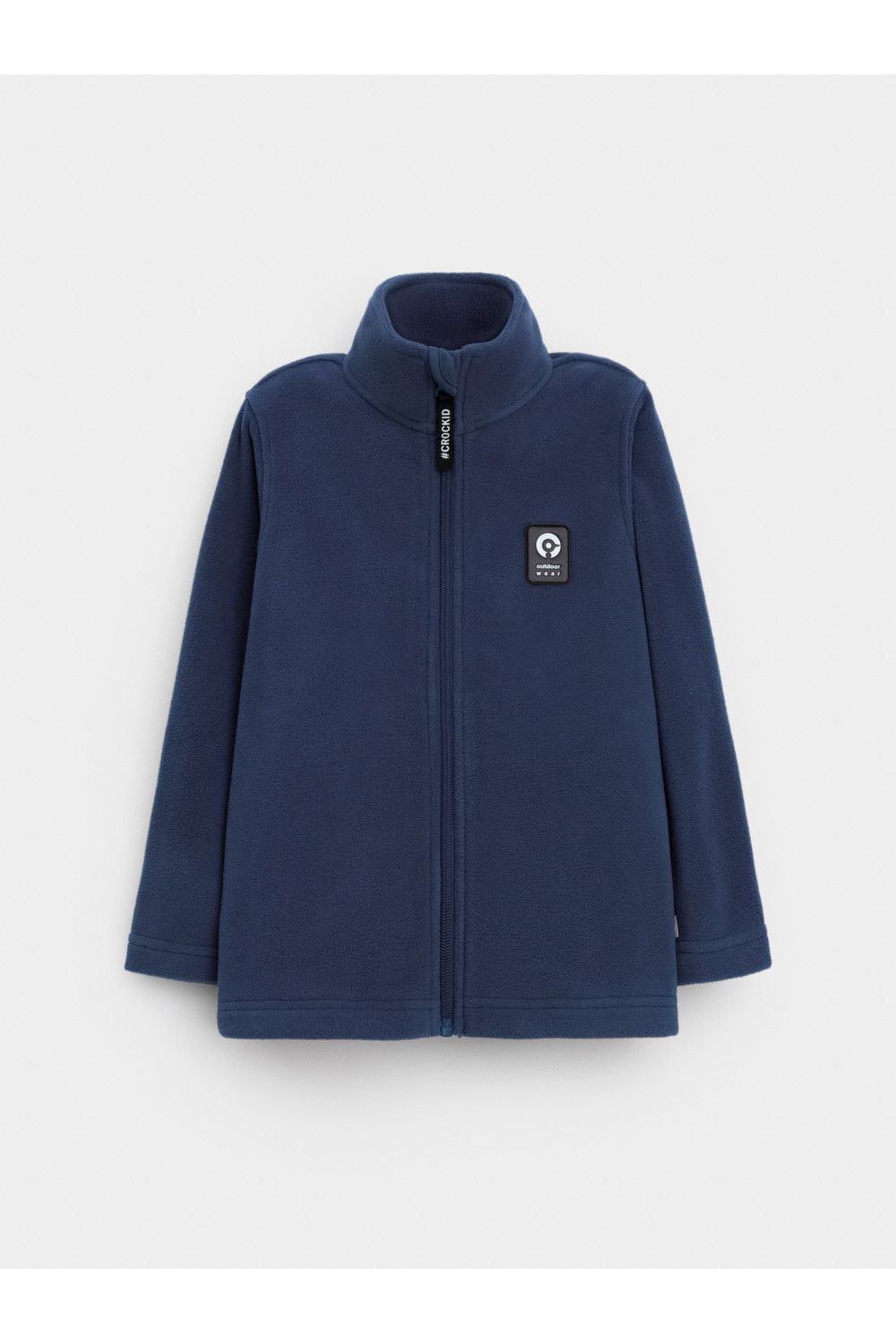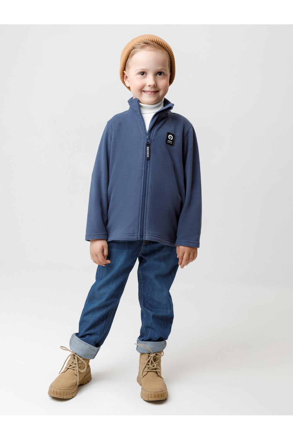 Флисовая куртка для мальчика. У изделия высокий воротник и застёжка на молнию с мягкой защитой шеи и подбородка. По бокам два кармана. Куртка сохраняет цвет и форму после многократных стирок.