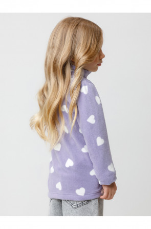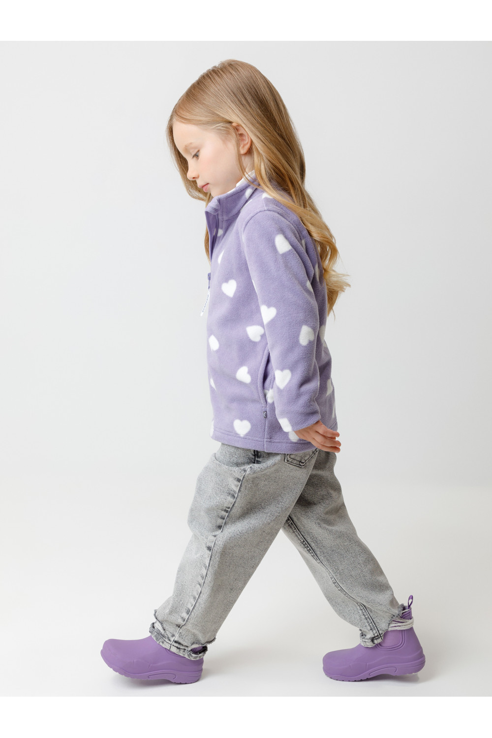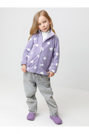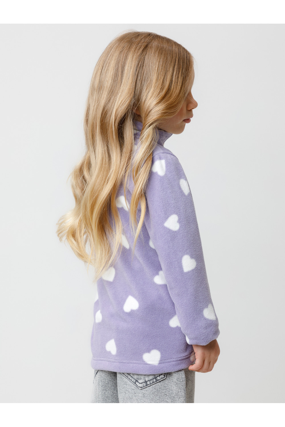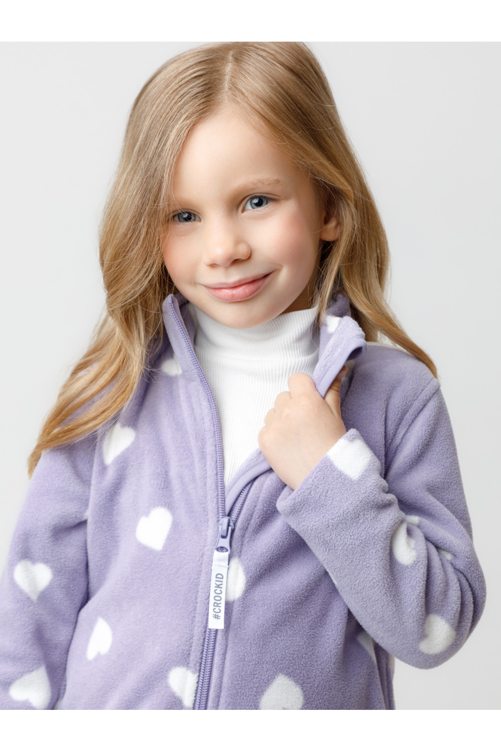 Флисовая куртка для девочки. У изделия высокий воротник и застёжка на молнию с мягкой защитой шеи и подбородка. По бокам два кармана. Оригинальная набивка выполнена из стойких гипоаллергенных текстильных красителей. Куртка сохраняет цвет и форму после многократных стирок.