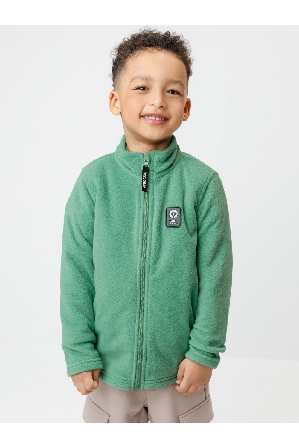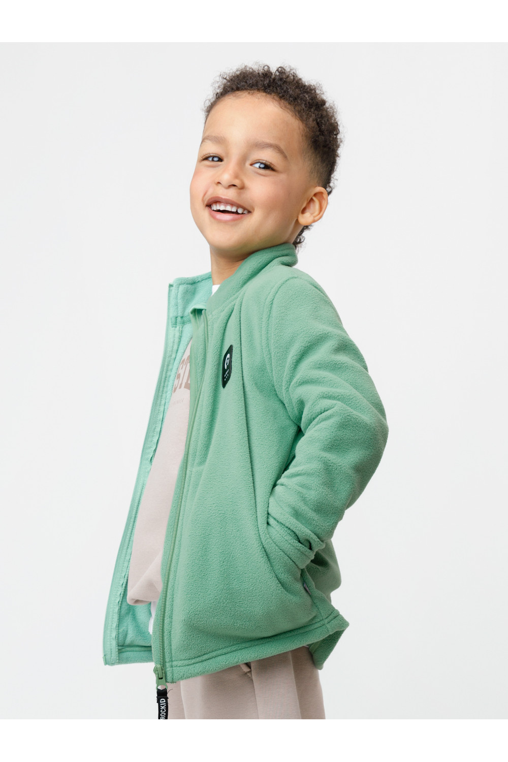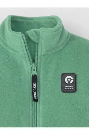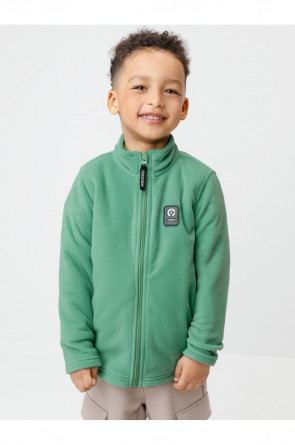 Флисовая куртка для мальчика. У изделия высокий воротник и застёжка на молнию с мягкой защитой шеи и подбородка. По бокам два кармана. Спереди украшена фирменной нашивкой. Куртка сохраняет цвет и форму после многократных стирок.