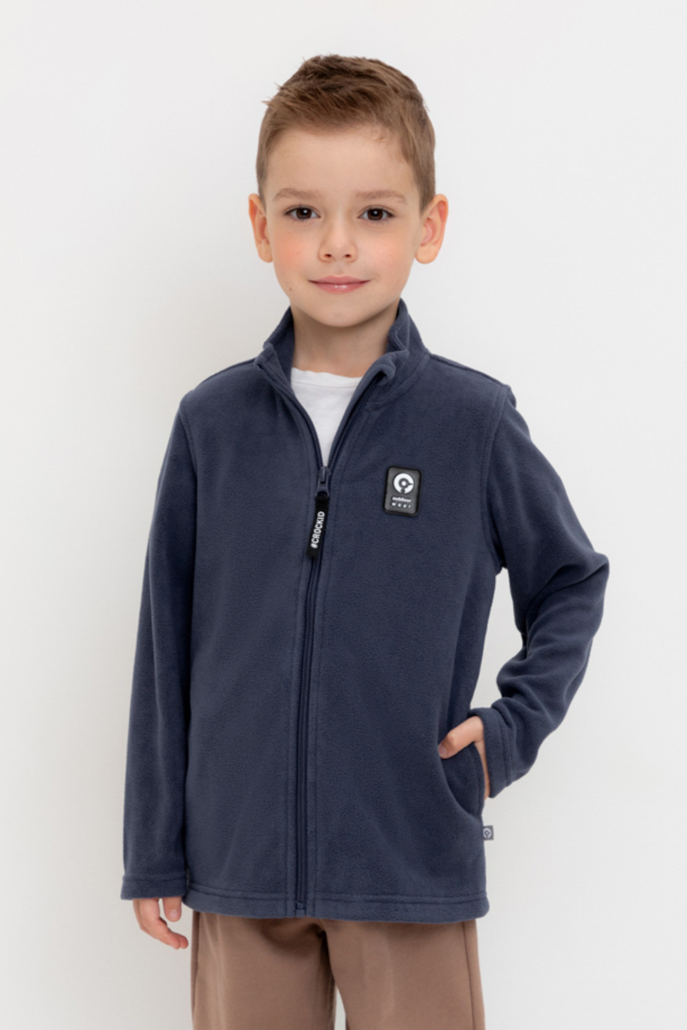 Флисовая куртка для мальчика. У изделия высокий воротник, предусмотрена защита шеи и подбородка, по бокам карманы. Куртка сохраняет цвет и форму после многократных стирок.