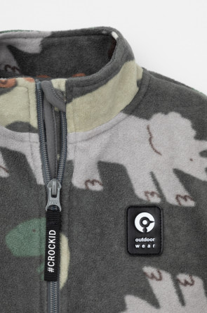 Флисовая куртка для мальчика. У изделия высокий воротник, предусмотрена защита шеи и подбородка, по бокам карманы. Оригинальная набивка выполнена из стойких, гипоаллергенных текстильных красителей. Куртка сохраняет цвет и форму после многократных стирок.