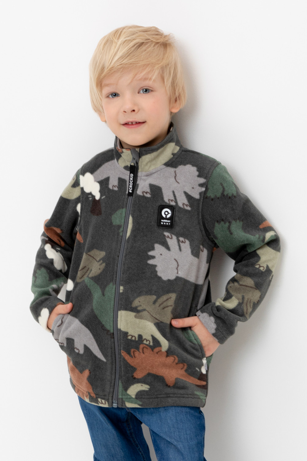 Флисовая куртка для мальчика. У изделия высокий воротник, предусмотрена защита шеи и подбородка, по бокам карманы. Оригинальная набивка выполнена из стойких, гипоаллергенных текстильных красителей. Куртка сохраняет цвет и форму после многократных стирок.
