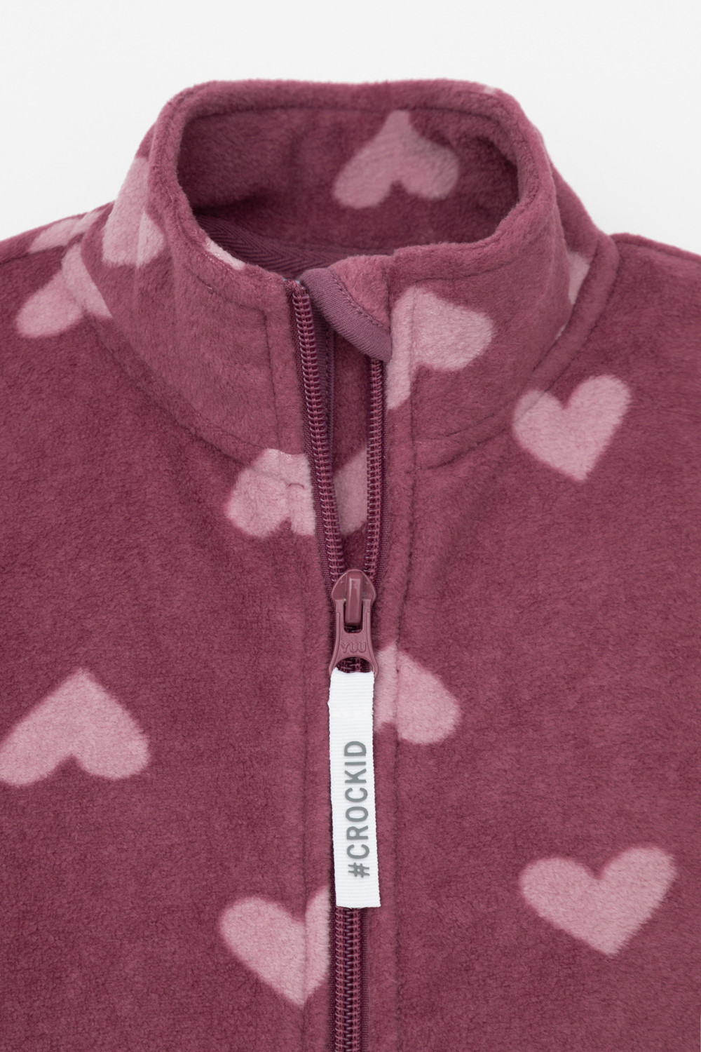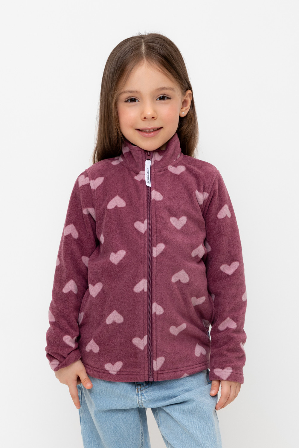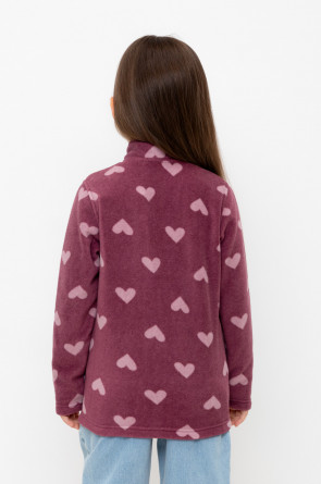 Флисовая куртка для девочки. У изделия высокий воротник, предусмотрена защита шеи и подбородка, по бокам карманы. Оригинальная набивка выполнена из стойких, гипоаллергенных текстильных красителей. Куртка сохраняет цвет и форму после многократных стирок.