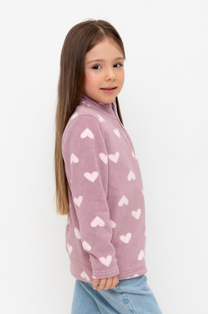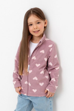 Флисовая куртка для девочки. У изделия высокий воротник, предусмотрена защита шеи и подбородка, по бокам карманы. Оригинальная набивка выполнена из стойких, гипоаллергенных текстильных красителей. Куртка сохраняет цвет и форму после многократных стирок.
