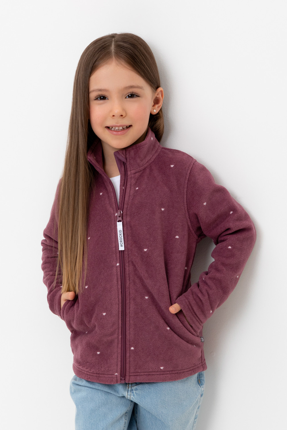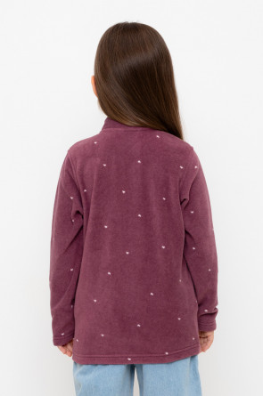 Флисовая куртка для девочки. У изделия высокий воротник, предусмотрена защита шеи и подбородка, по бокам карманы. Оригинальная набивка выполнена из стойких, гипоаллергенных текстильных красителей. Куртка сохраняет цвет и форму после многократных стирок.