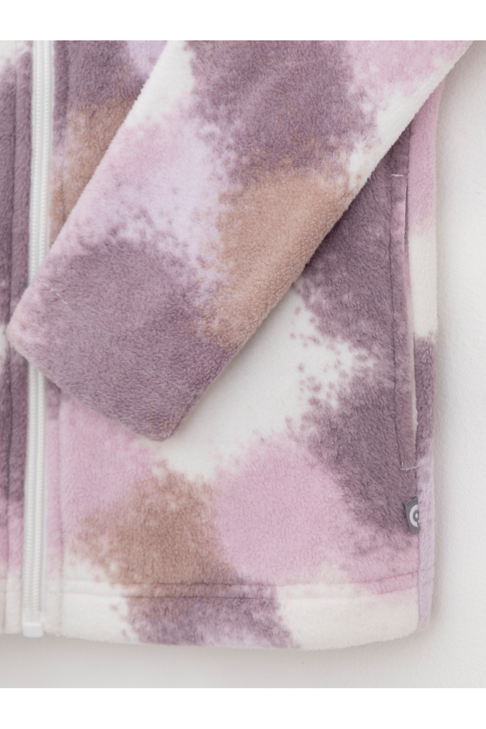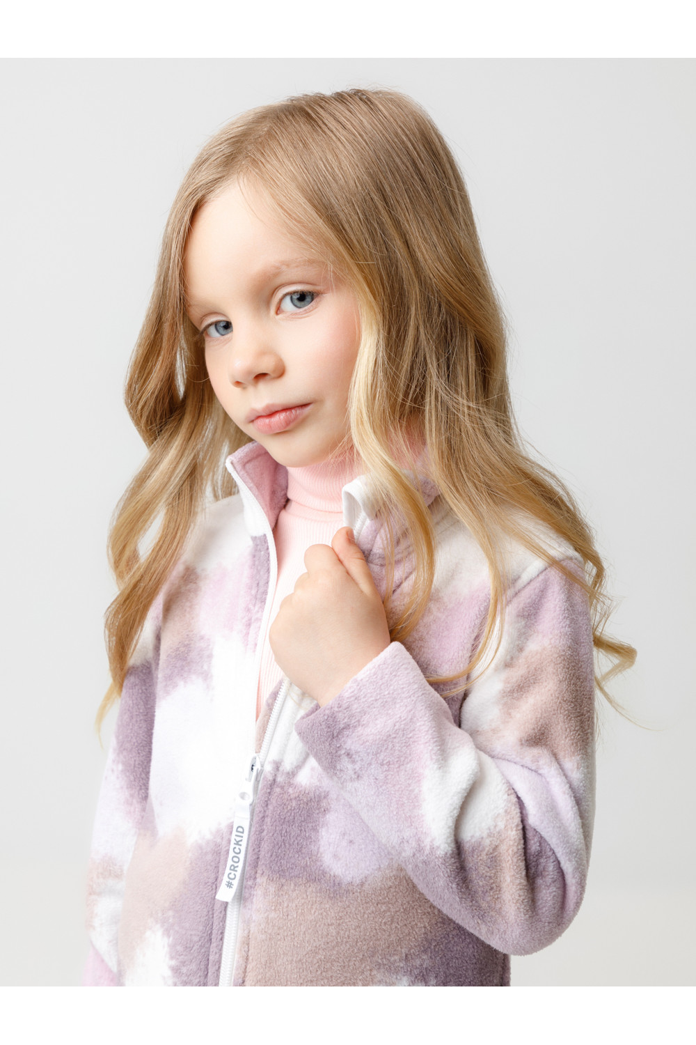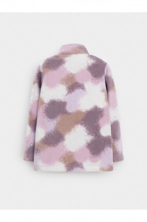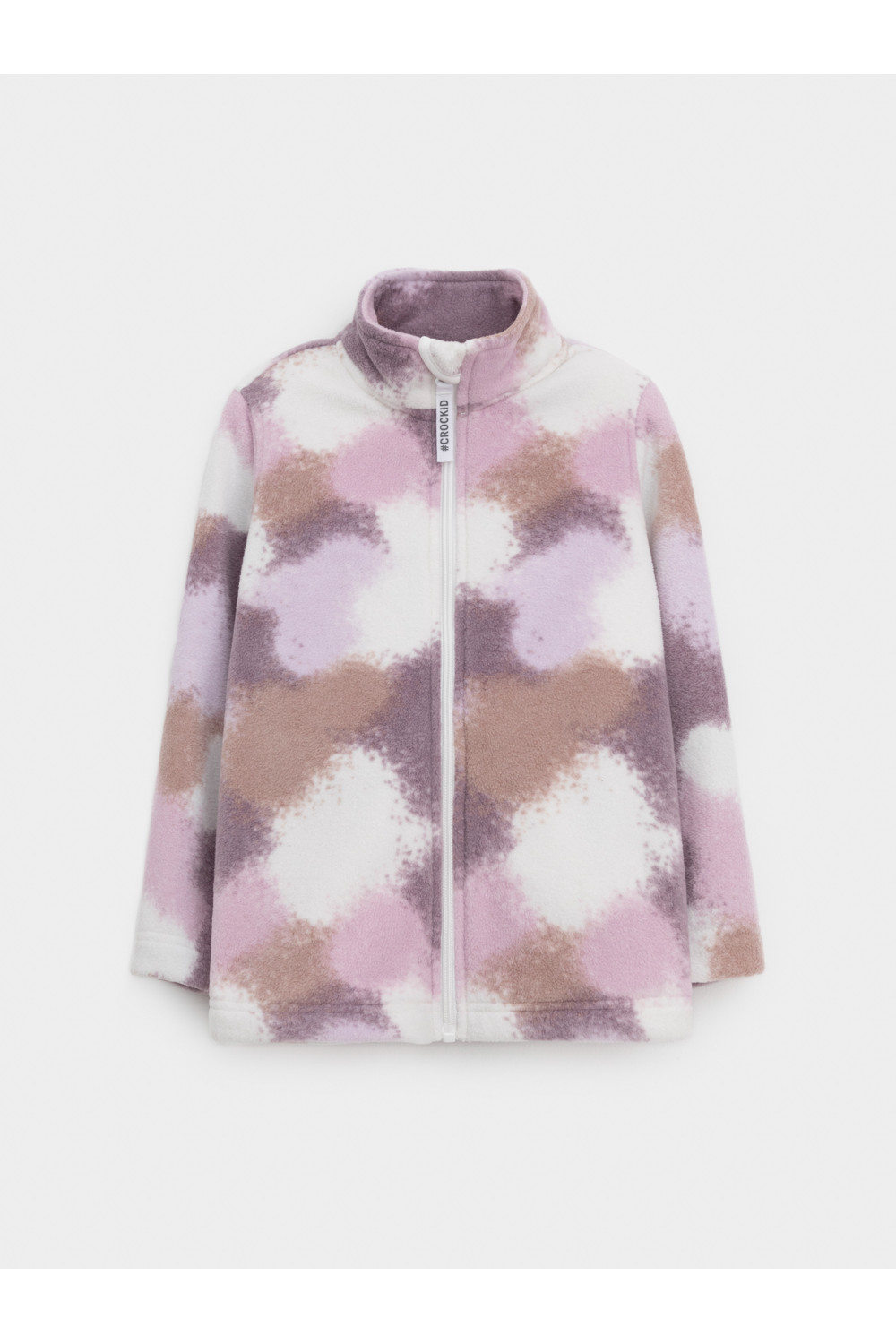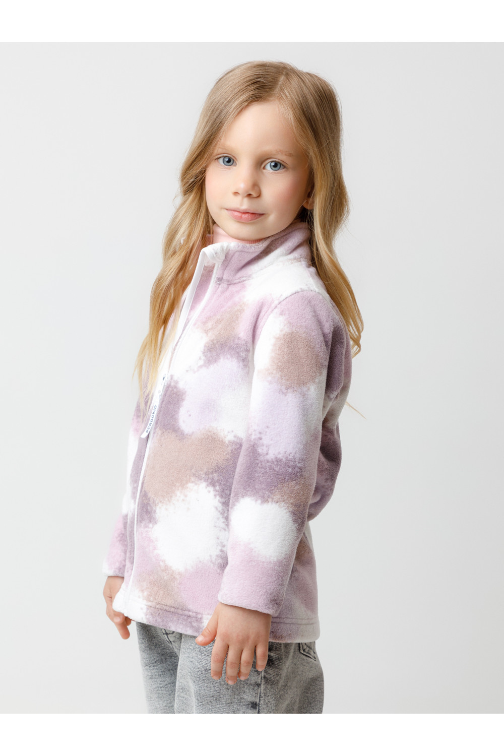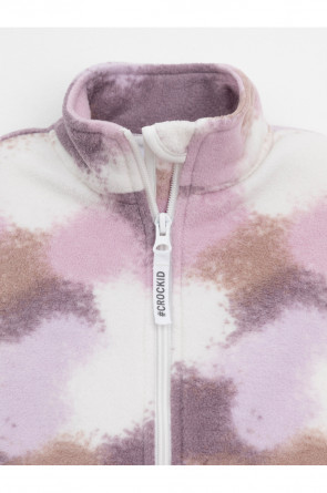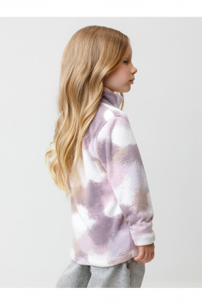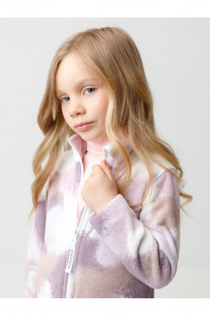 Флисовая куртка для девочки. У изделия высокий воротник и застёжка на молнию с мягкой защитой шеи и подбородка. По бокам два кармана. Оригинальная набивка выполнена из стойких гипоаллергенных текстильных красителей. Куртка сохраняет цвет и форму после многократных стирок.