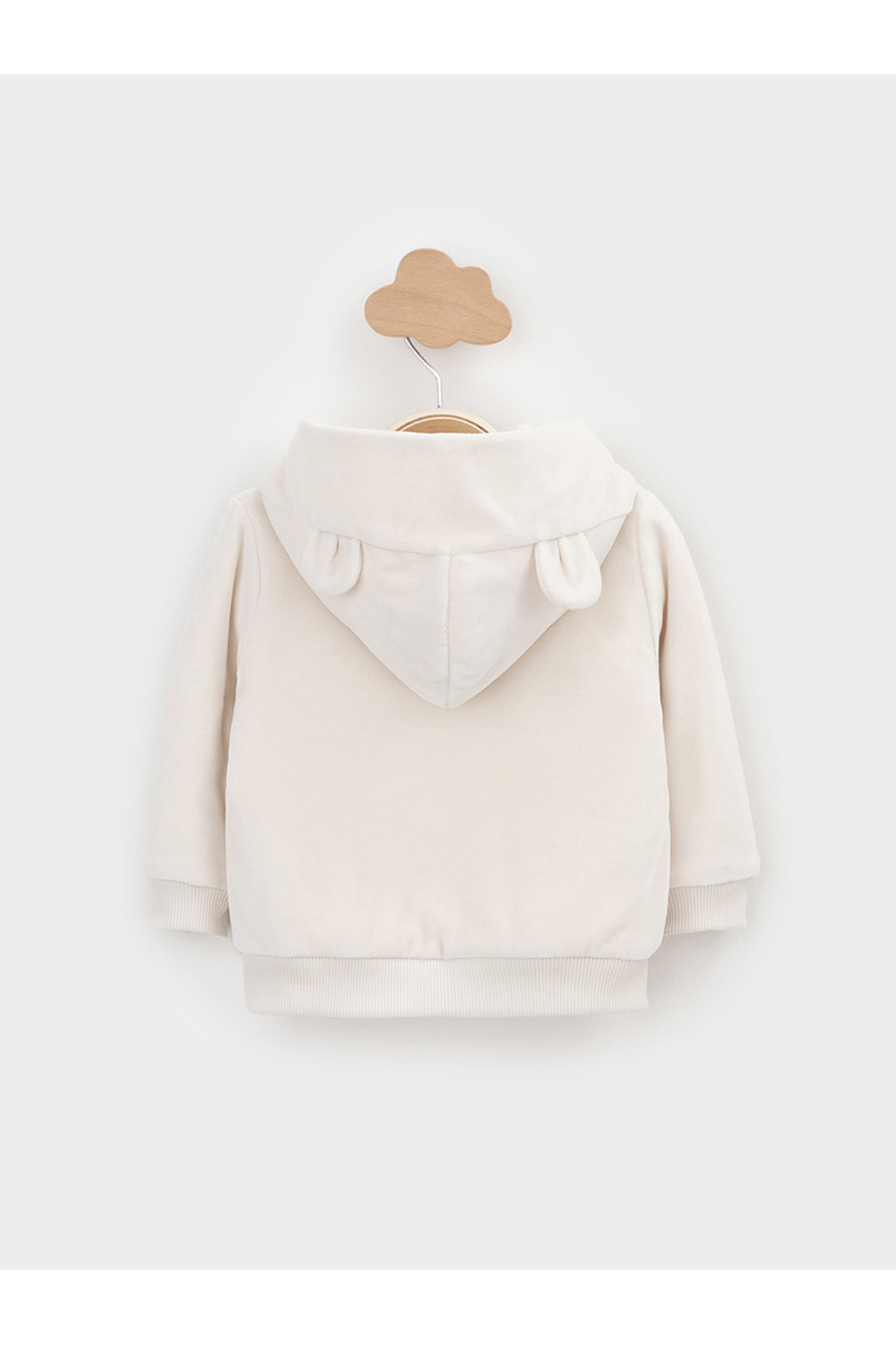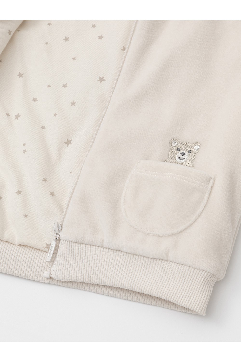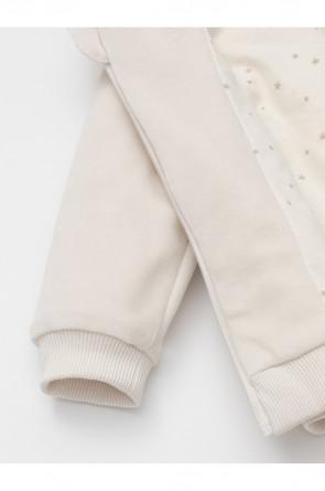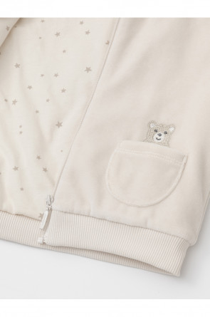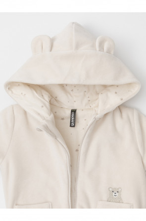 Тёплая куртка из велюра для новорождённых. Внутри синтепон и подклад из натурального хлопка. Изделие застёгивается на молнию и имеет капюшон. На рукавах мягкие манжеты, внизу - эластичный пояс. Спереди два накладных кармана и украшение в виде вышивки. Все трикотажные полотна производятся в соответствии с нормами Швейцарского сертификата ЭкоТекс.