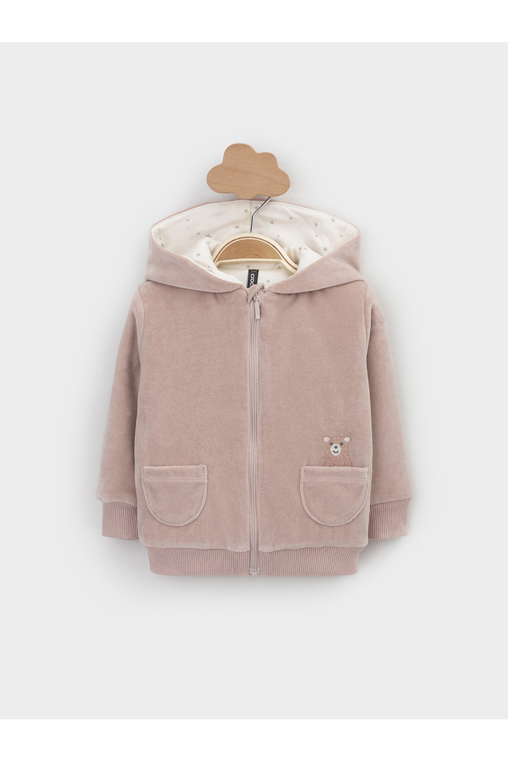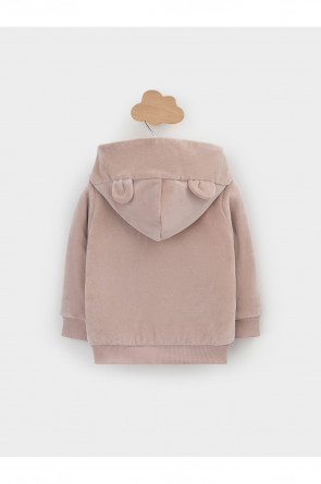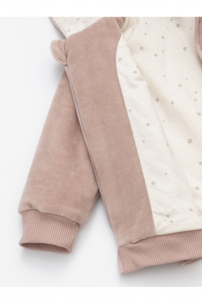 Тёплая куртка из велюра для новорождённых. Внутри синтепон и подклад из натурального хлопка. Изделие застёгивается на молнию и имеет капюшон. На рукавах мягкие манжеты, внизу - эластичный пояс. Спереди два накладных кармана и украшение в виде вышивки. Все трикотажные полотна производятся в соответствии с нормами Швейцарского сертификата ЭкоТекс.