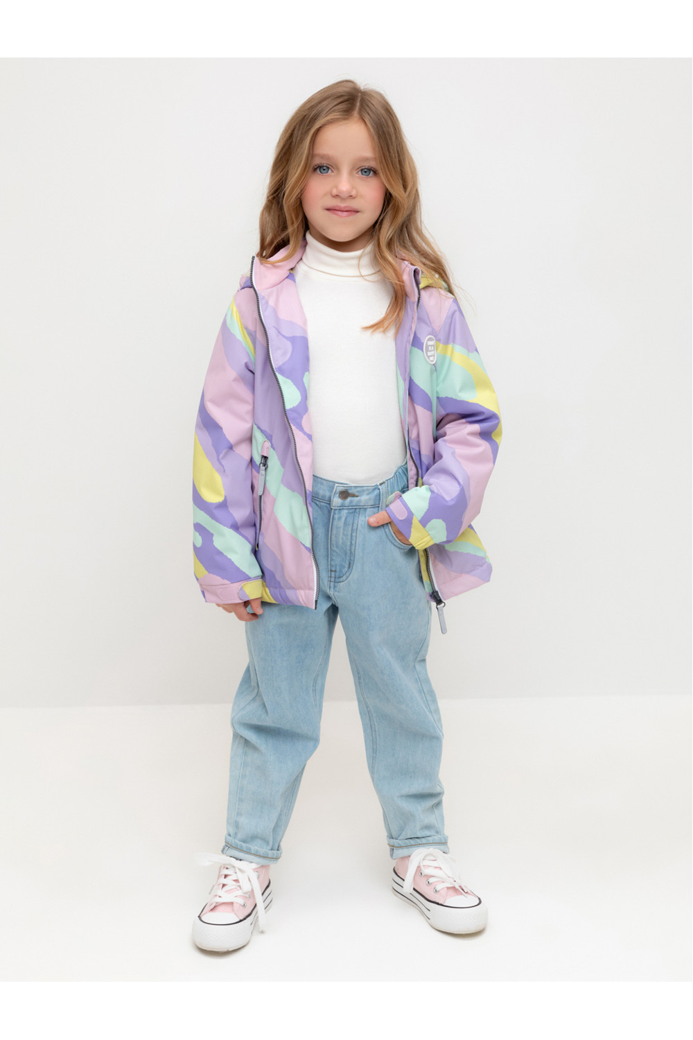 Демисезонная куртка для девочки с утеплителем SEE®: 120 г/м2. Выполнена из мембранной ткани с дополнительной тефлоновой обработкой. Данный вид обработки предохраняет изделие от загрязнения и лучше отводит влагу. Подклад из 100% полиэстера. У изделия предусмотрена защита подбородка. Несъемный капюшон имеет эластичную резинку для лучшего прилегания. Эластичные манжеты регулируются по ширине при помощи липучек. Низ изделия регулируется эластичной утяжкой со стопперам. Во всех изделиях верхнего ассортимента для безопасности ребенка предусмотрены светоотражающие элементы.
