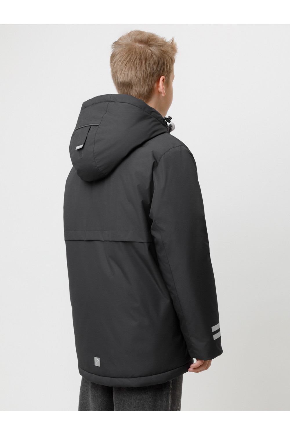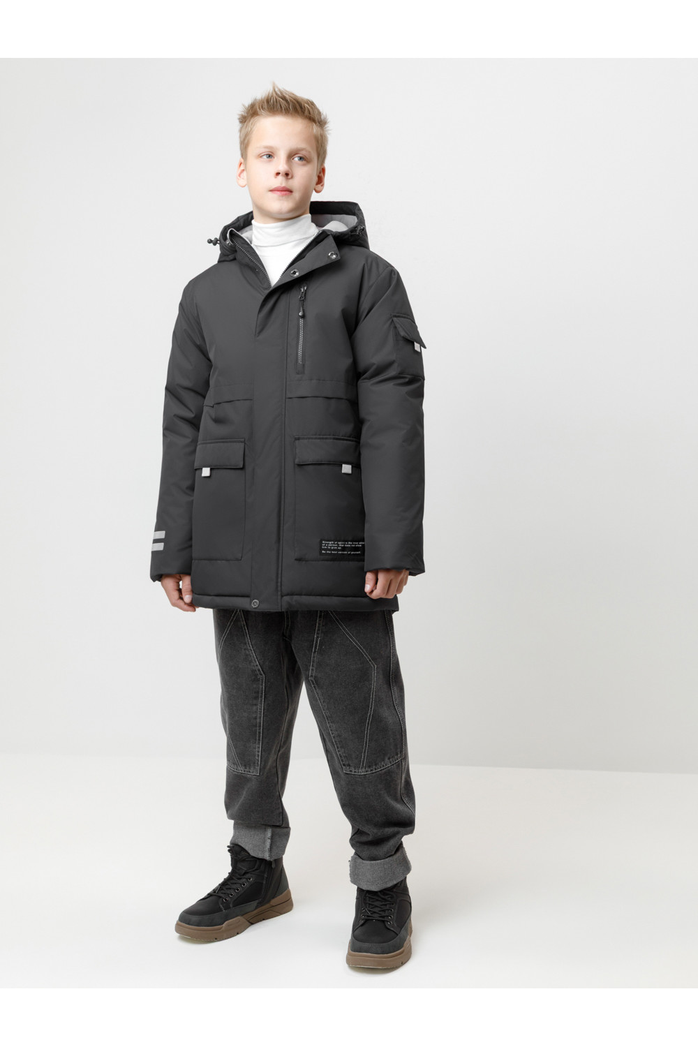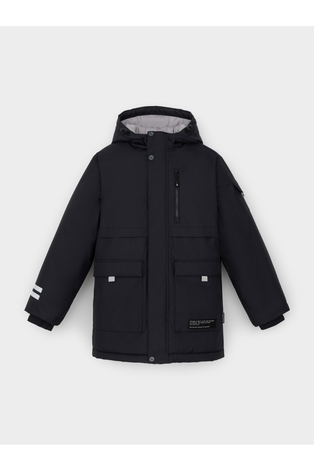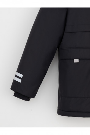 Зимняя куртка для мальчика с утеплителем SEE®: 250 г/м2. Выполнена из мембранной ткани с дополнительной тефлоновой обработкой, которая предохраняет изделие от загрязнений и отталкивает влагу. Подклад выполнен из 100% полиэстера Tricot. Куртка застёгивается на молнию и на дополнительную планку с кнопками. У изделия предусмотрена защита подбородка. Несъёмный капюшон имеет эластичную утяжку со стопперами, глубина капюшона регулируется при помощи липучки. На рукавах внутренние эластичные манжеты. Два накладных кармана с клапанами по бокам и один карман на груди. Во всех изделиях верхнего ассортимента для безопасности ребёнка предусмотрены светоотражающие элементы.