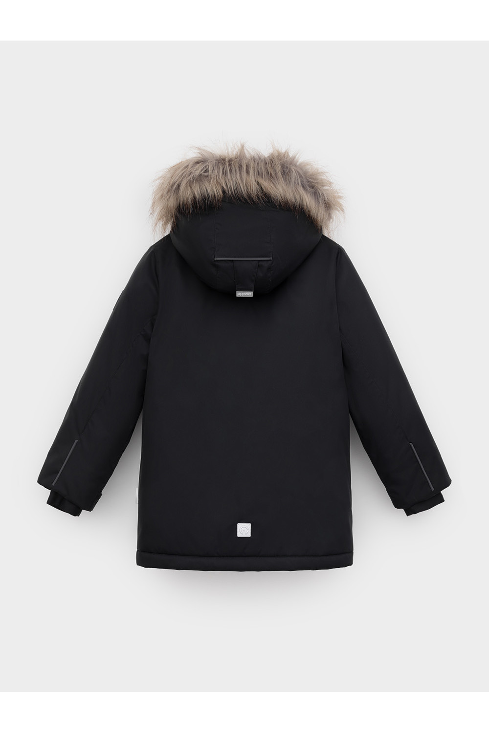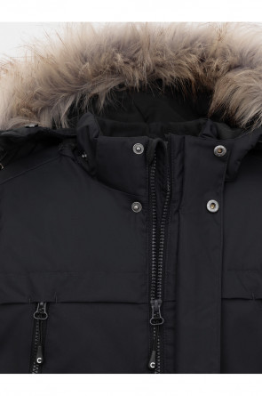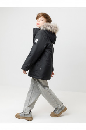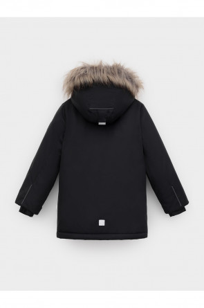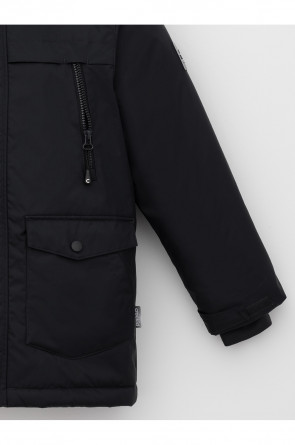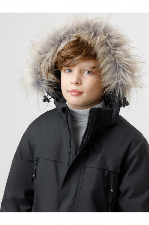 Зимняя куртка для мальчика с утеплителем SEE®: 250 г/м2. Выполнена из мембранной ткани с дополнительной тефлоновой обработкой, которая предохраняет изделие от загрязнений и отталкивает влагу. Подклад выполнен из 100% полиэстера Tricot. Куртка застёгивается на молнию и внешнюю планку с металлическими кнопками, предусмотрена защита подбородка. Съёмный капюшон на кнопках и липучках имеет эластичную утяжку со стопперами и отстёгивающуюся опушку из искусственного меха, регулируется по глубине. На рукавах внутренние эластичные манжеты, ширина рукава регулируется при помощи липучки. По бокам два накладных кармана и два кармана с молниями на груди. По талии эластичная утяжка со стопперами. Во всех изделиях верхнего ассортимента для безопасности ребёнка предусмотрены светоотражающие элементы.