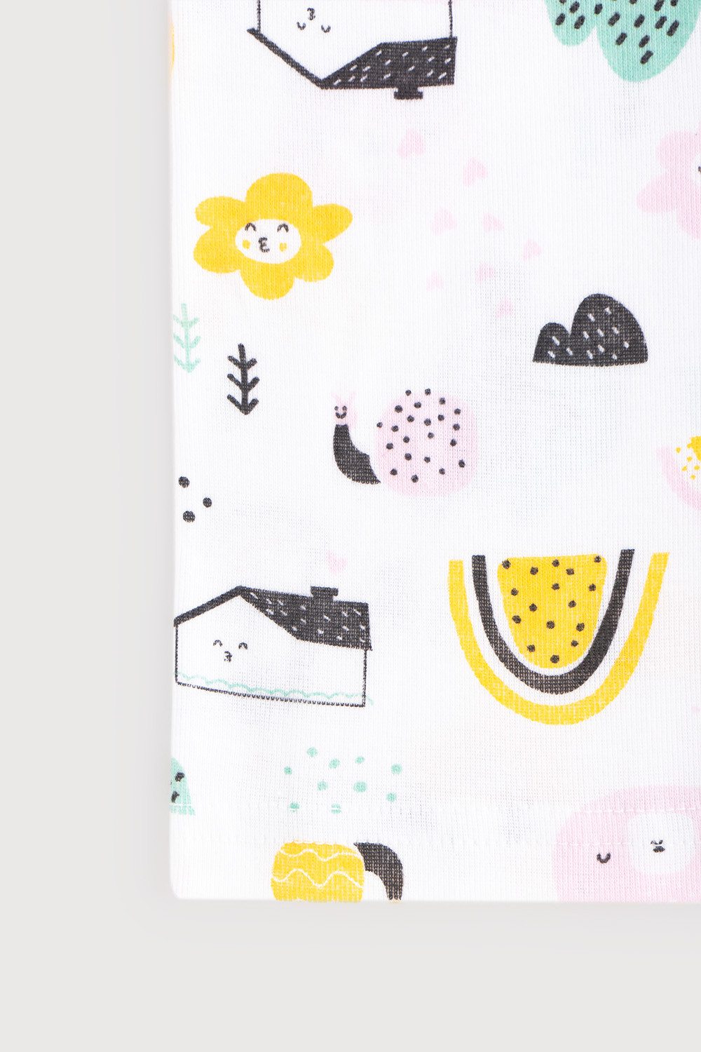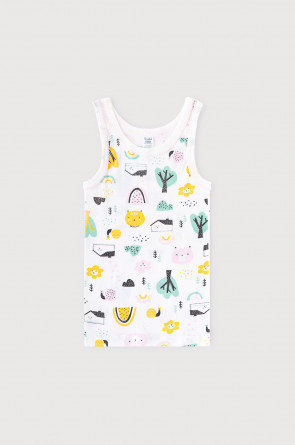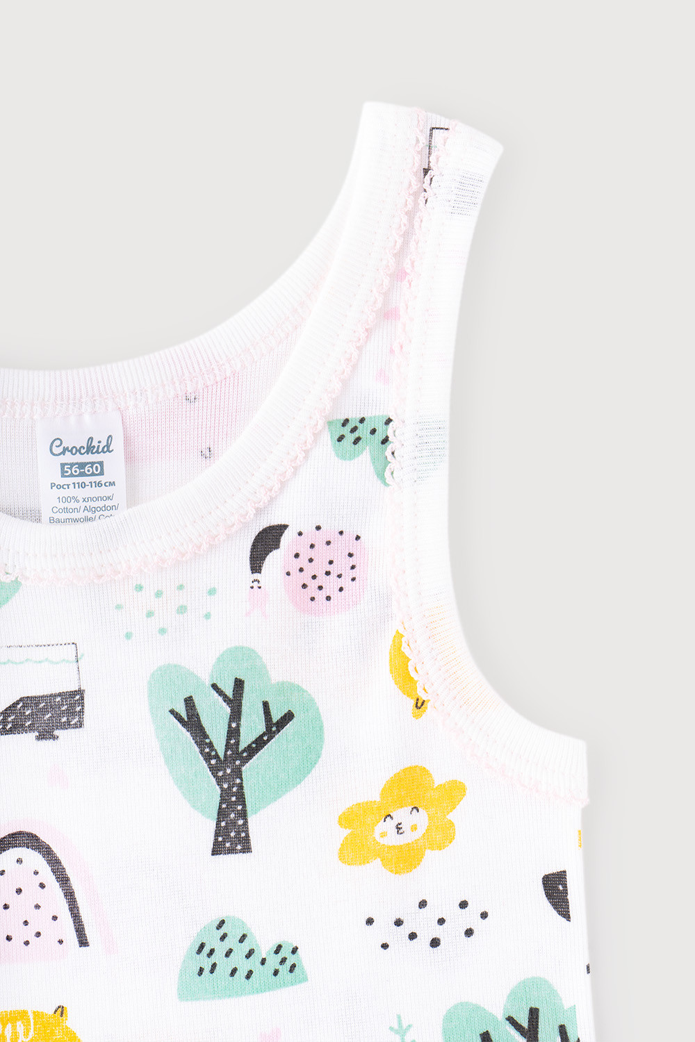 Майка на лямках из натурального хлопка. Сшита из эластичного материала рибана пенье. Украшена набивным рисунком.