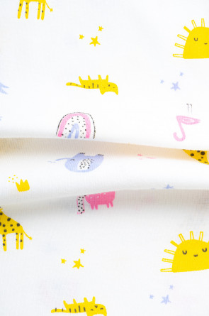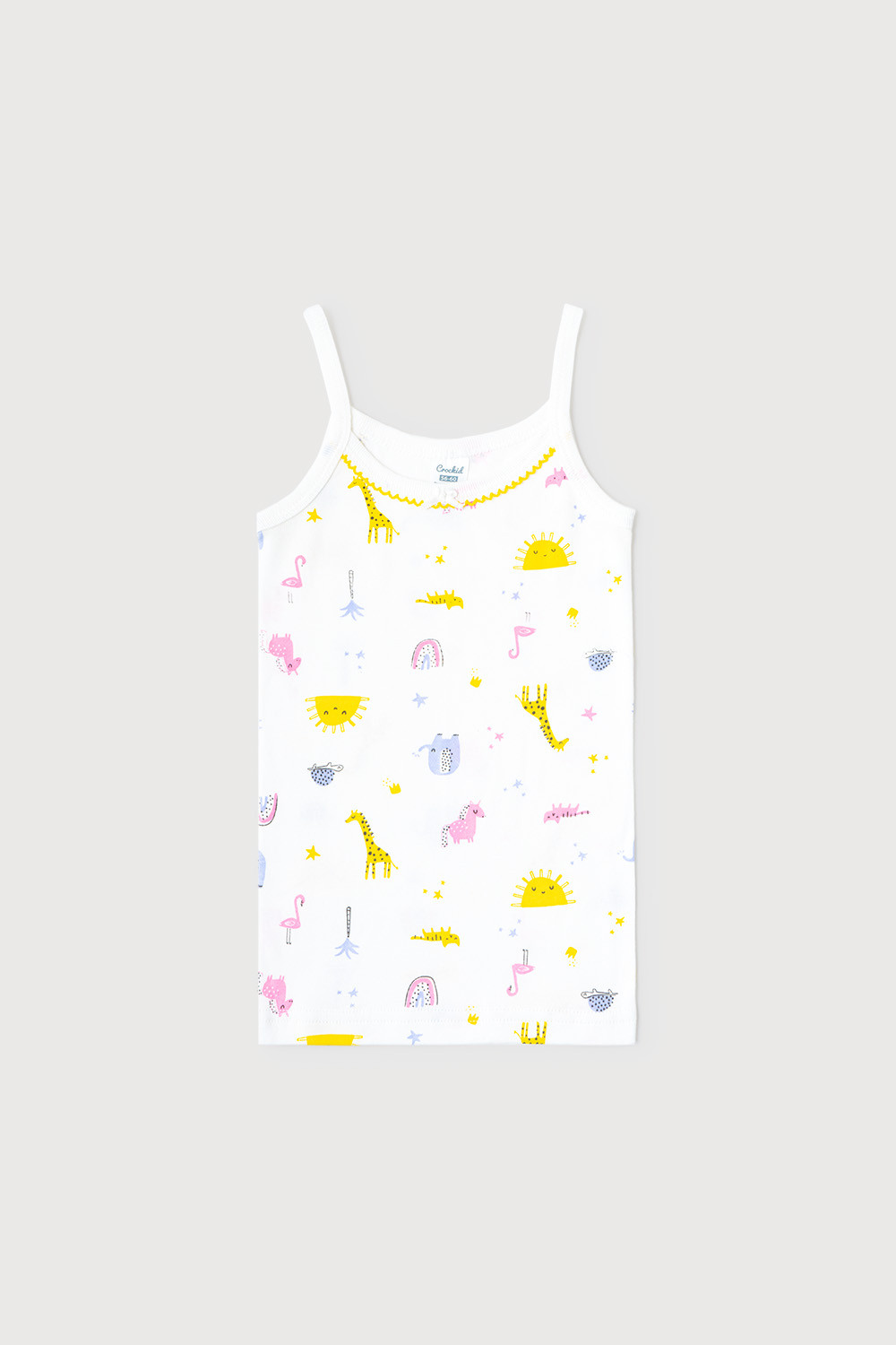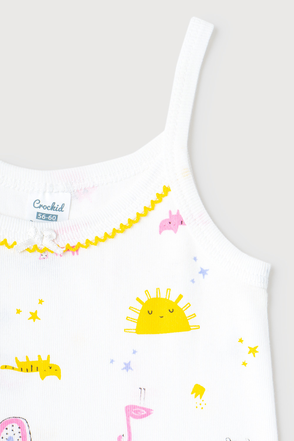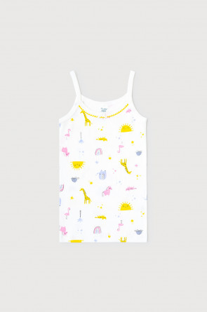 Майка на бретелях из натурального хлопка. Сшита из эластичного материала рибана пенье. Украшена набивным рисунком и милым бантиком.