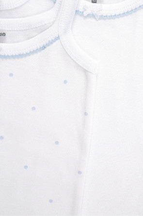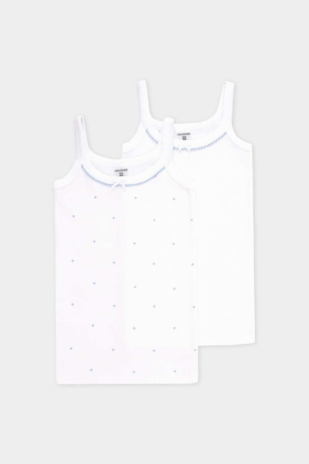 Трикотажные майки в комплекте 2 шт на тонких бретелях из однотонной рибаны, горловина и проймы обработаны кантом, по горловине полочки мережка и атласный бантик. Сохраняют цвет и форму после многократных стирок. Все трикотажные полотна производятся в соответсвии с нормами Швейцарского сертификата ЭкоТекс.